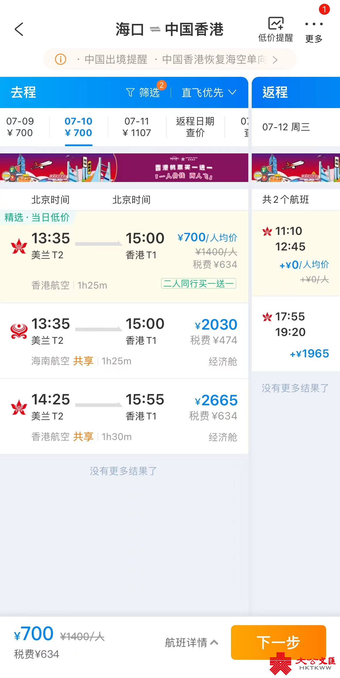 值得留意的是,「二人同行買一送一」活動頁面顯示的價格為折後人均價,並非兩人價格。例如海口往返香港的航班,人均機票價格700元、稅費634元,選擇兩位乘機人後,旅客實際需要支付的總價為2668元。