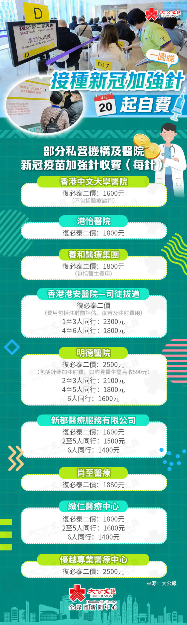 【大公報記者王亞毛、伍軒沛報道】新冠疫情升溫,醫務衞生局局長盧寵茂形容是「春夏之間一個小波幅」,本港醫療系統有能力應付,但呼籲高危組別人士需要接種新冠加強針。由今日起,不屬於五個優先組別的市民,若想打第四針或第五針加強劑,需自費於私營市場接種,大公報記者查詢多間私營醫院與診所,普遍有提供復必泰二價疫苗作為加強劑,每針收費由1600至2500元左右不等,部分提供多人接種優惠。