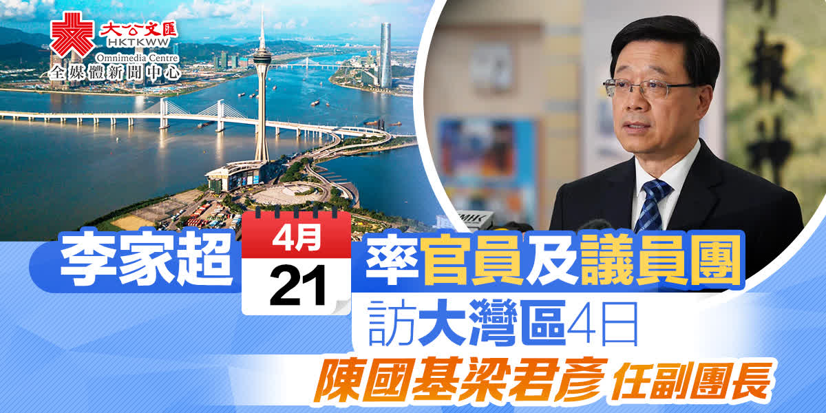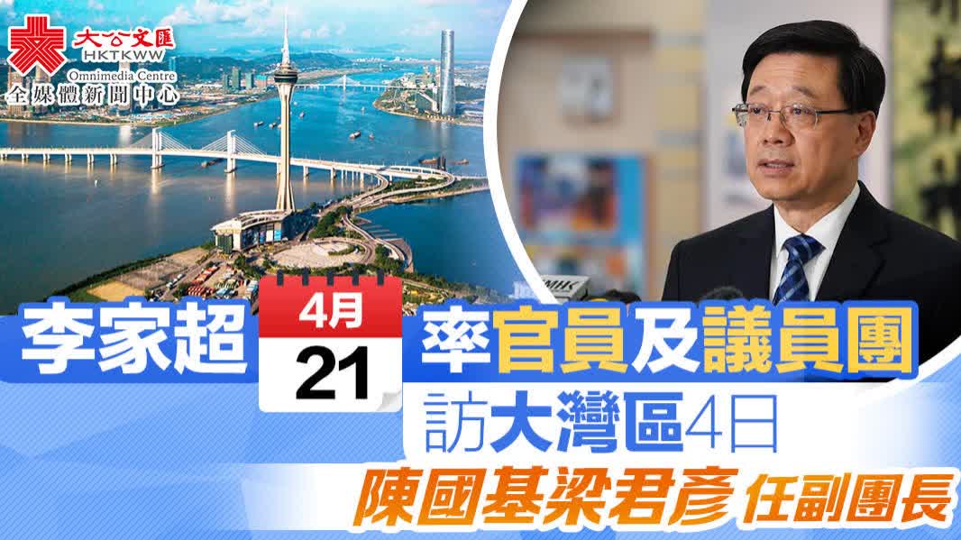 大公文匯全媒體報道,行政長官李家超明日(21日)率領香港特區政府及立法會大灣區訪問團依次到訪深圳、東莞、佛山和廣州四個大灣區城市進行為期4天的訪問。訪問團由李家超任團長,政務司司長陳國基和立法會主席梁君彥分別任副團長。