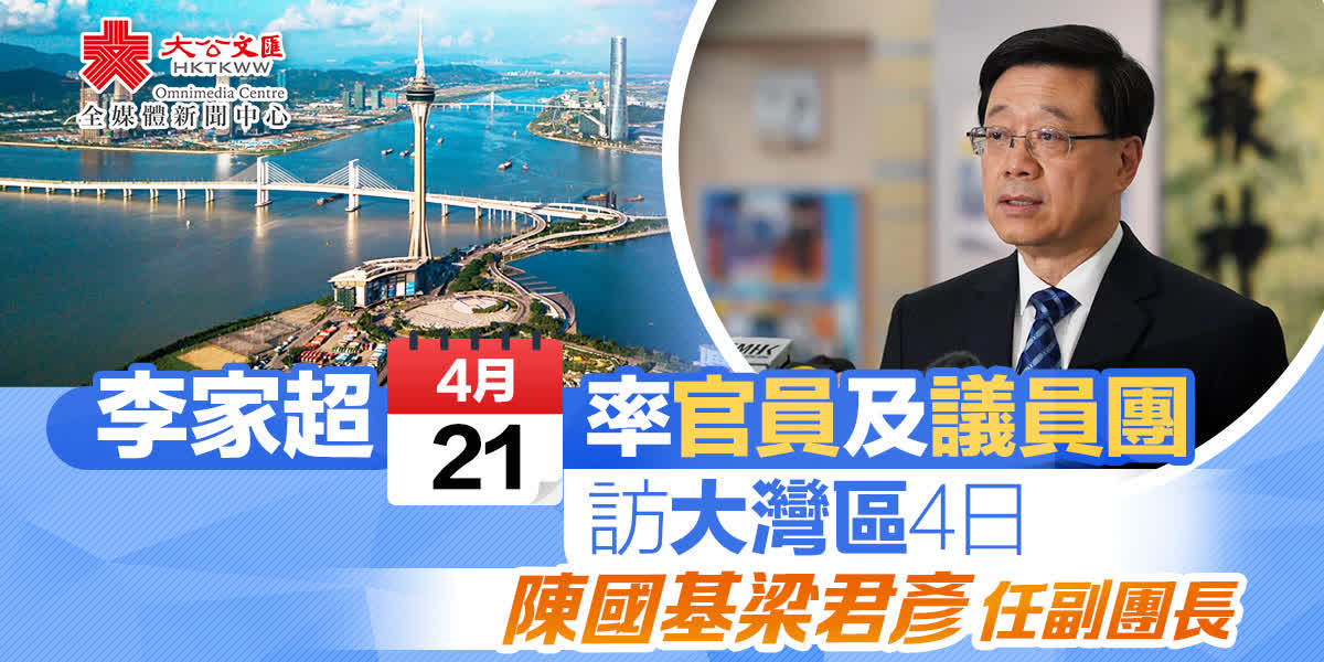 (大公文匯全媒體 記者 李九歌)行政長官李家超今日(21日)率領香港特區政府及立法會大灣區訪問團,依次到訪深圳、東莞、佛山和廣州進行為期4天的訪問。訪問團出發前會拍攝合照,李家超下午在政府總部會見傳媒。