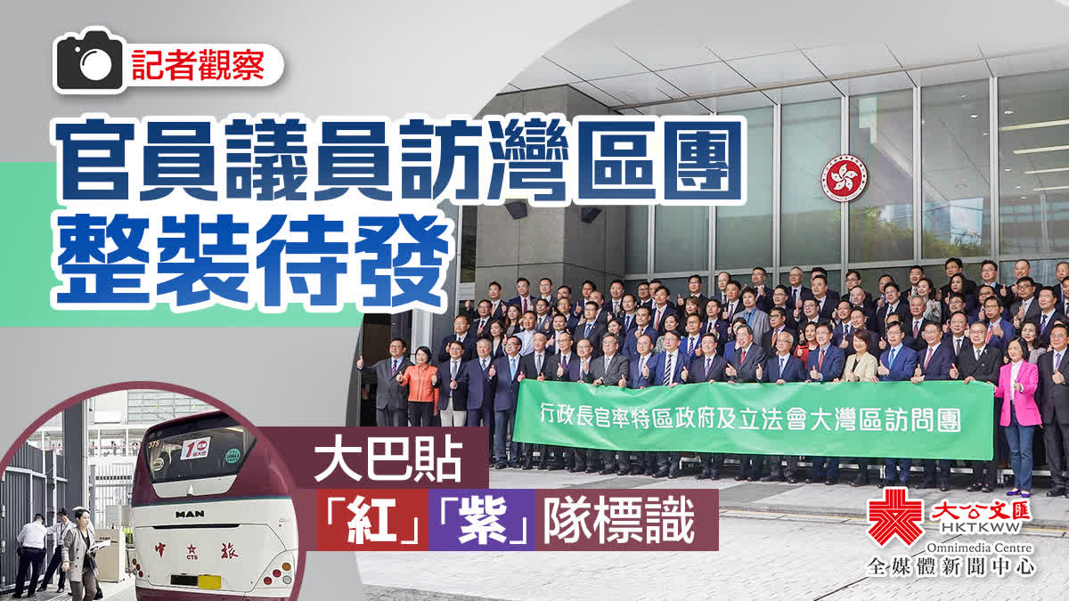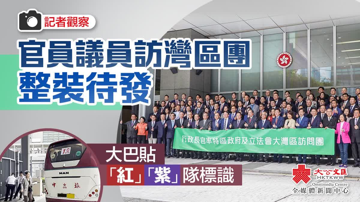 下午約3時,政府總部門口十分熱鬧,傳媒行家全部出動,連立法會天橋上也聚集了不少人圍觀,等待立法會議員合照及行政長官見記者。記者見到停泊的大巴車上貼有「紅隊」「紫隊」標識,紅隊議員將前往東莞,紫隊議員將前往佛山,惟目前具體行程仍未公布。