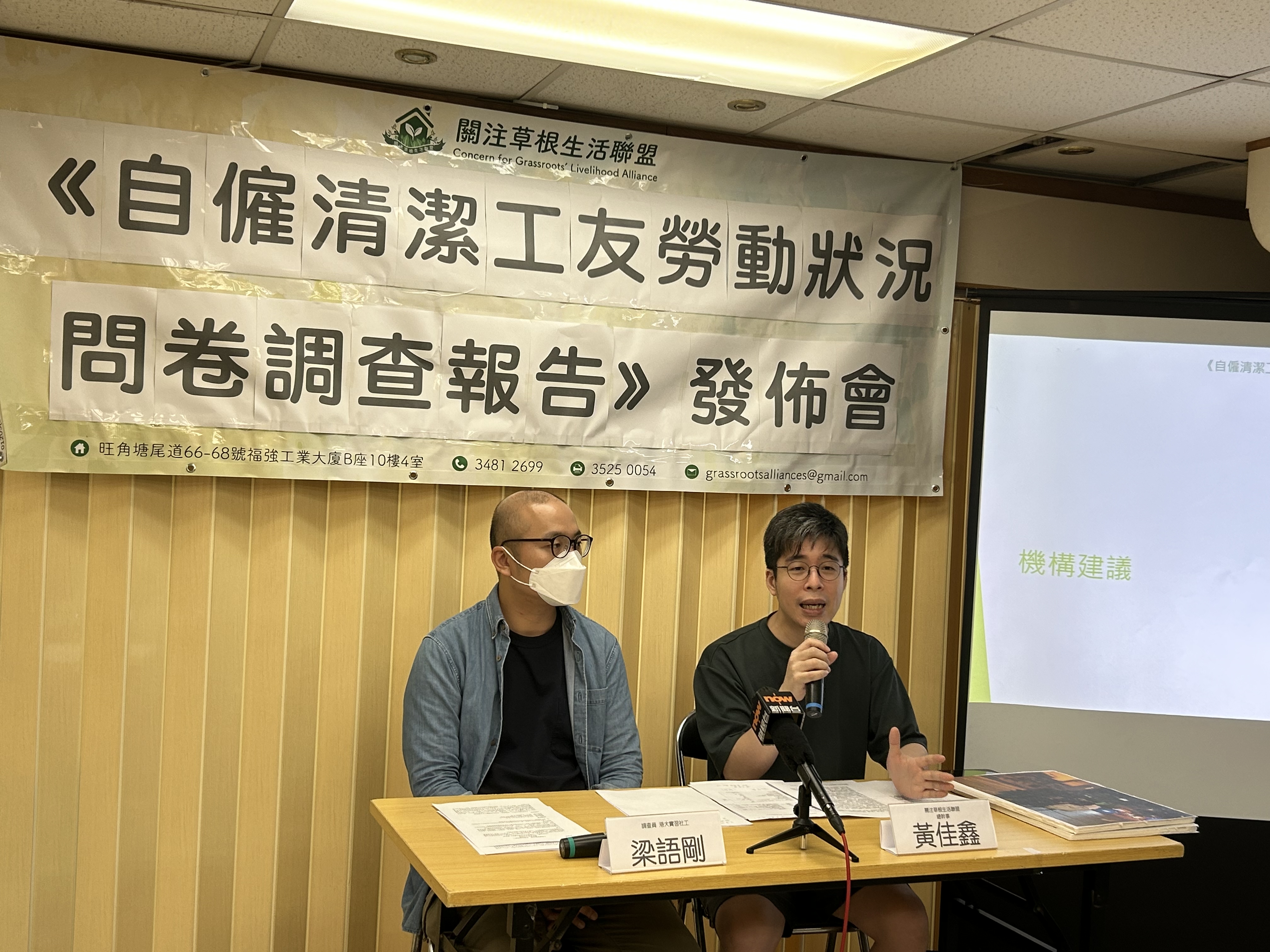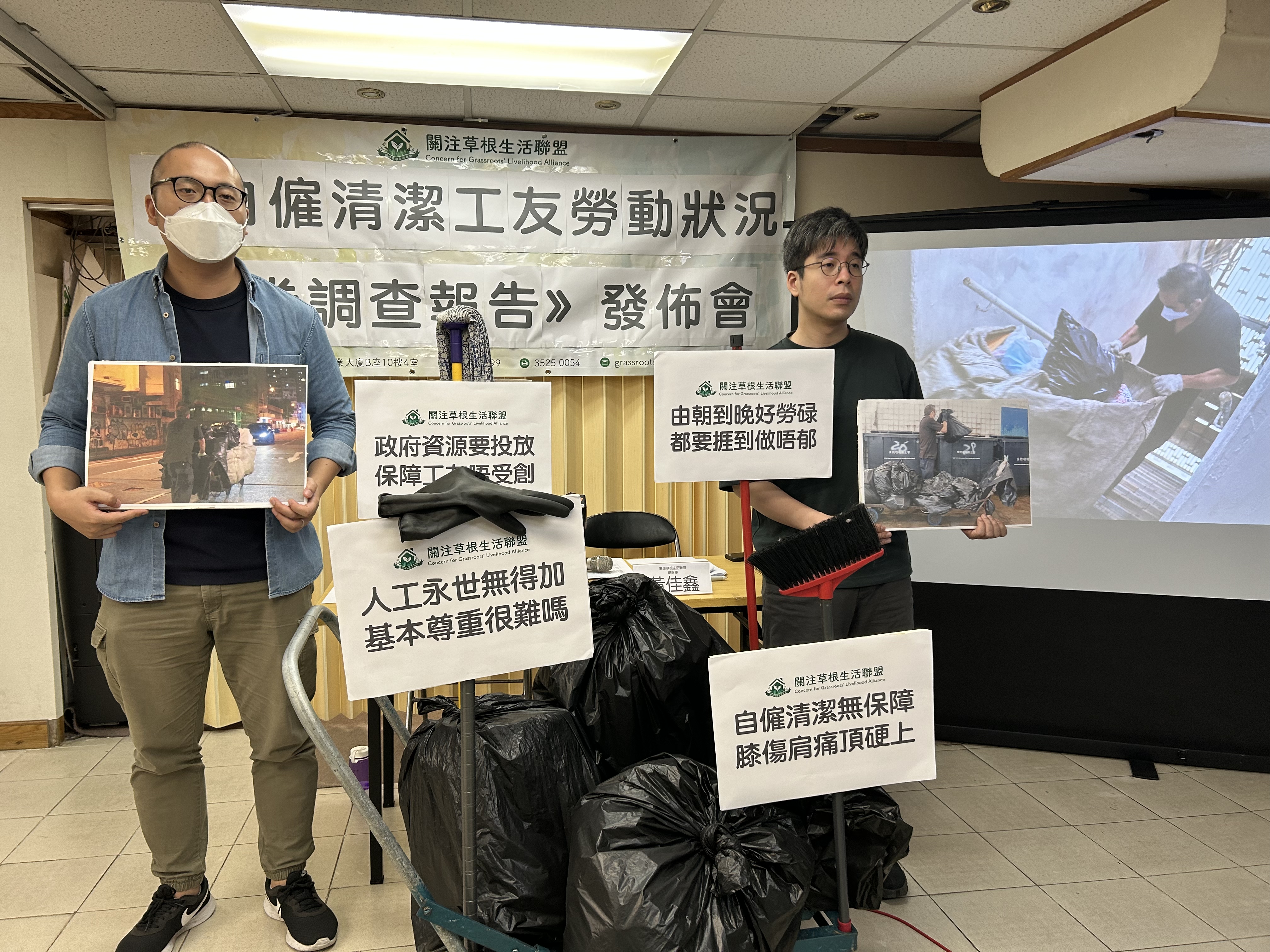 (大公文匯全媒體記者 嚴璐瑶)「關注草根生活聯盟」(關草聯)在2023年3至4月間訪問了30位在旺角及大角咀從事大廈清潔、倒樓和運送餐廳垃圾的自僱清潔工友,了解他們的勞動狀況及職業安全健康情況。五一勞動節將至,關草聯今天(22日)發布《自僱清潔工友勞動狀況問卷調查報告》,反映工友面對的處境及困難。
