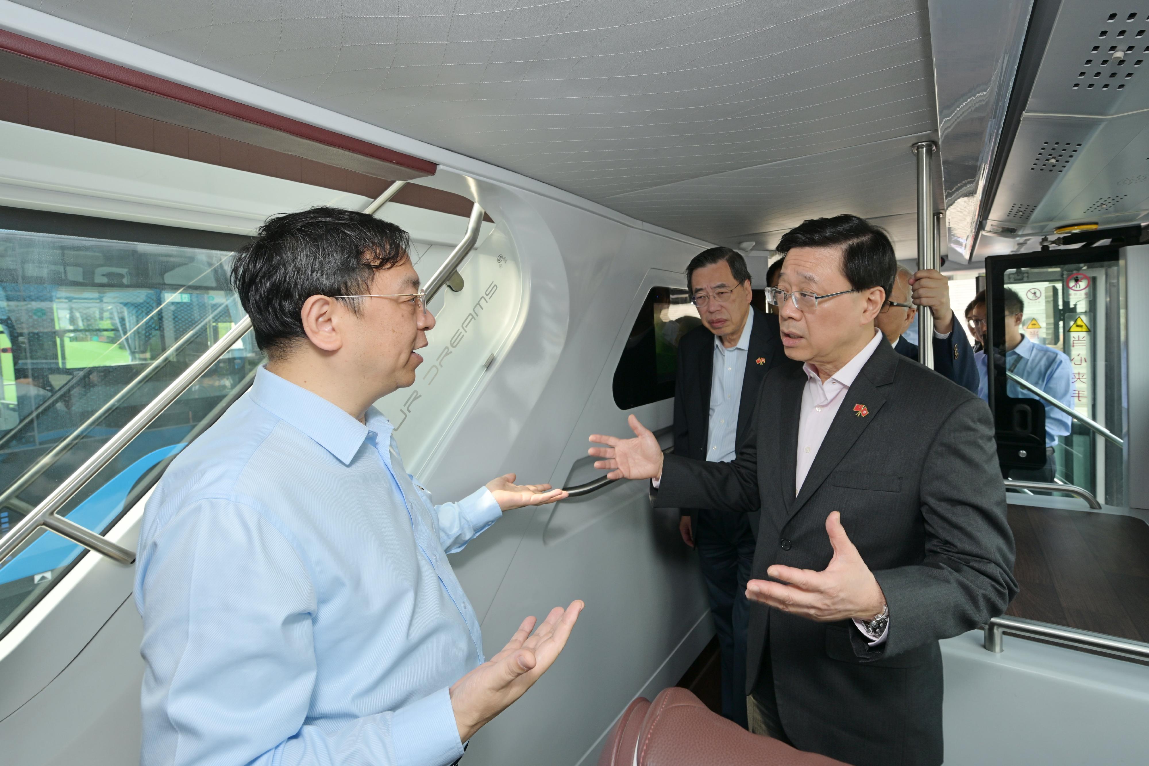 早上,李家超率領代表團到比亞迪股份有限公司位於深圳的總部考察,了解該公司在汽車、軌道交通、新能源和電子等領域的最新發展,並體驗立體智能交通系統「雲巴」。
