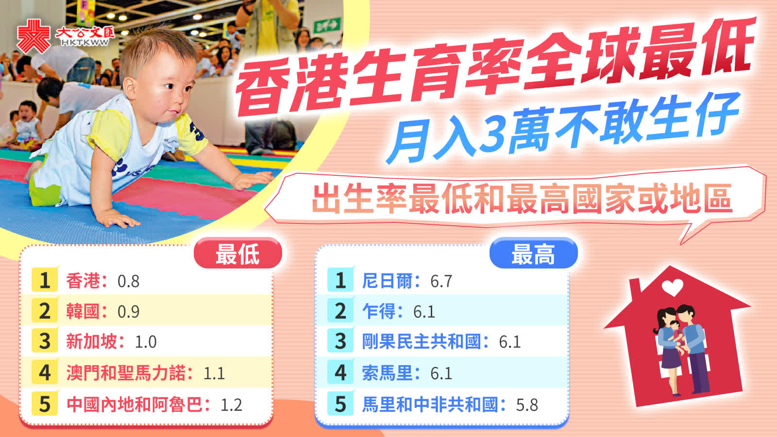 (大公報記者 伍軒沛 邵穎 易曉彤)港人生育率全球最低!根據聯合國人口基金(UNFPA)最新公布的年度「世界人口狀況」報告,數據顯示,香港女性平均每人僅生育0.8個孩子,屬全球最低生育率。有家庭月入三萬元的90後夫婦打算生育,考慮養育開支後,坦言「不敢生育」;有即將升格為媽媽的立法會議員指出,本港房屋問題是生育面前的難關。
