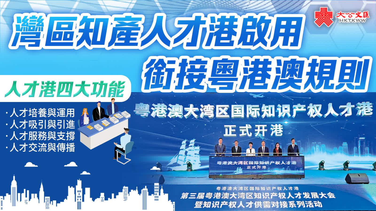 (香港文匯報記者 敖敏輝)由廣東省市場監督管理局(知識產權局)、香港知識產權署、澳門經濟及科技發展局聯合舉辦的第三屆粵港澳大灣區知識產權人才發展大會21日在中新廣州知識城開幕,旨在打造大灣區知識產權人才交流、流通專業平台。大會上,粵港澳大灣區國際知識產權人才港正式開港,將聚焦人才培養與運用、人才吸引與引進、人才服務與支撐、人才交流與傳播四大功能(見表),推動大灣區知識產權務實合作,實現人才自由流動。業界指,香港在知識產權人才、運行機制等方面有明顯優勢,應進一步打通人才、管理數據等系統,推動大灣區知識產權「軟聯通」,助推大灣區打造國際科技創新中心。