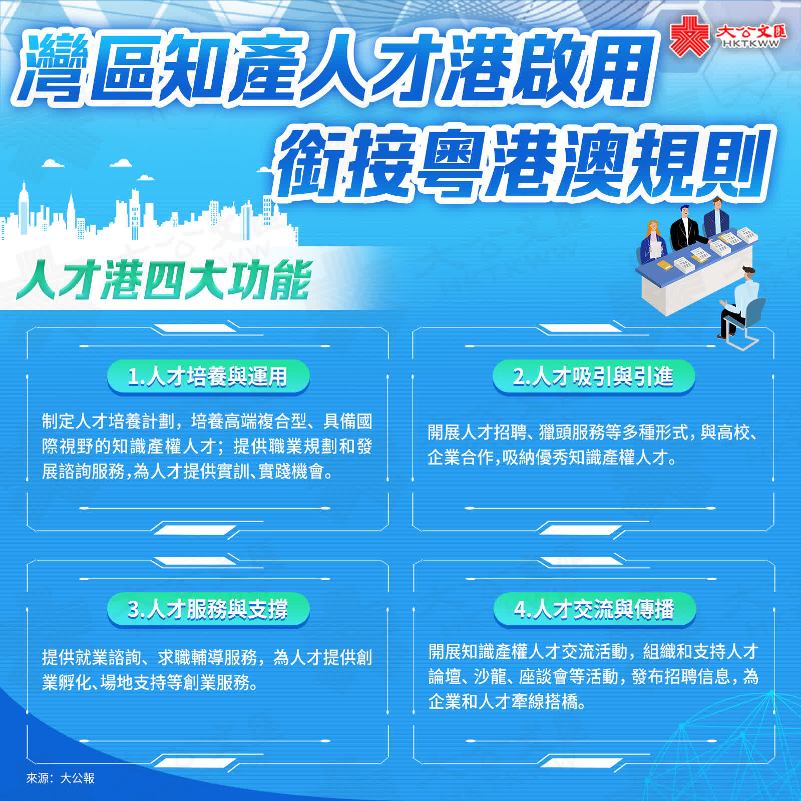 比如,在人才培養與運用方面,依託人才港,將制定大灣區人才培養計劃,培養高端複合型、具備國際視野的知識產權人才;提供職業規劃和發展諮詢服務;為人才提供職業培訓、實踐機會。