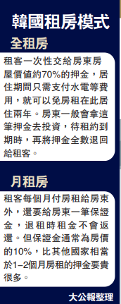 全租房是韓國特有的一種租房模式,即租客一次性交給業主房屋價值約70%的押金,就可以免房租在此居住兩年。業主將押金存入銀行收取利息或是用於投資,收益取代房租,待租約到期時,再將押金全數退回給租客。