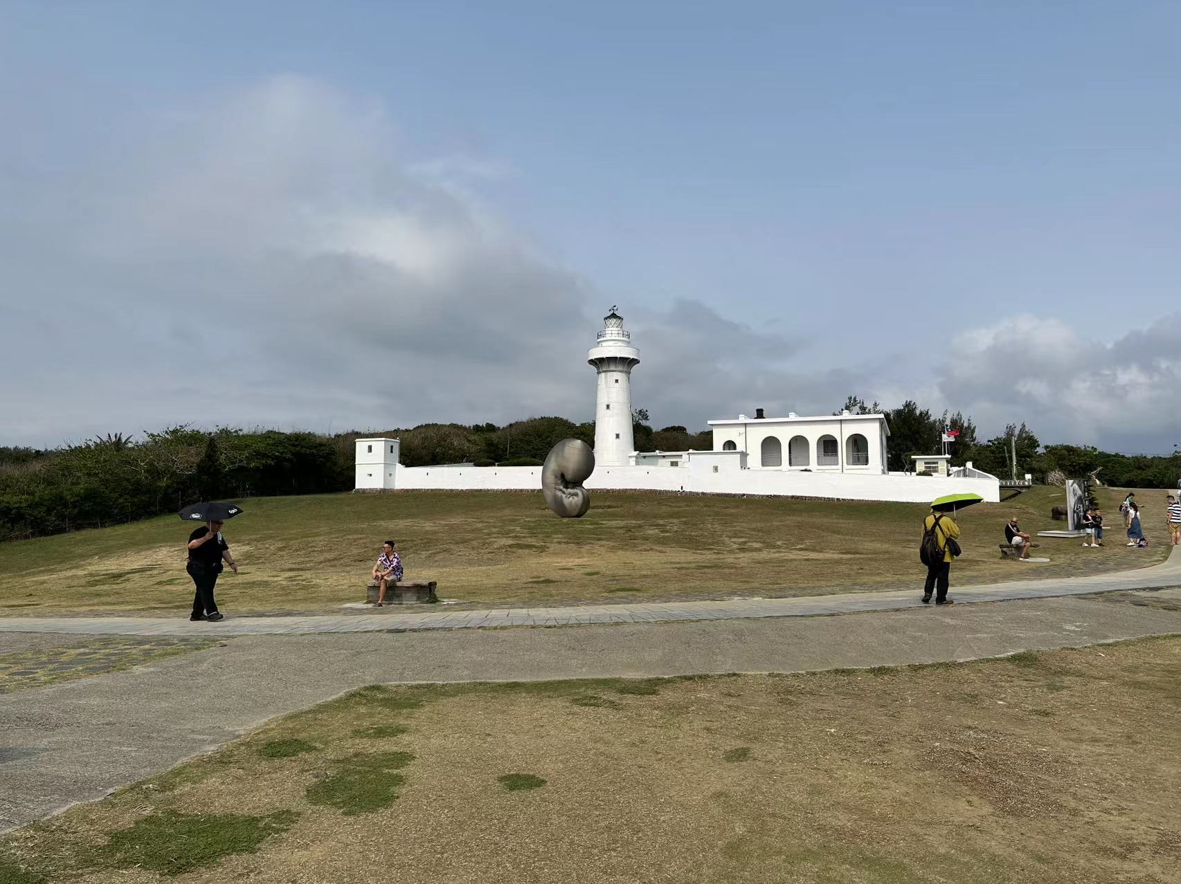 那是位於台灣南部屏東縣恒春鎮鵝鑾鼻公園內的鵝鑾鼻燈塔。燈塔高21.4公尺,光度達180萬燭光,是台灣地區光力最強的燈塔,有「東亞之光」的美譽,正對着巴士海峽。純白色的燈塔與南台灣的好天氣超匹配,白天在藍天白雲、大草皮的映襯下,洋溢充滿度假氛圍。筆者由下塌處自駕過來這裏才14分鐘,停車場收費40新台幣,時間好像沒有限制。由停車場經過排列在兩旁的紀念品攤檔,便是售票處,盛惠60元新台幣。