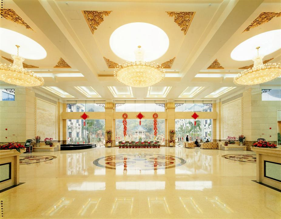 松園賓館採用中國傳統建築中與自然對話、天人合一的思路進行規劃布置,以嶺南自由式庭院空間布局將傳統的明堂式和四合院式串聯起來,建築三面環繞,勢態均衡,庭院中心沒有建築,外實內虛。左、中、右三路前後串聯,中路為主入口,設一主大堂,與前庭院、內庭院貫通。前為明堂水,內庭院為自然生態的嶺南庭院,符合「四水歸堂」的傳統布局形式。