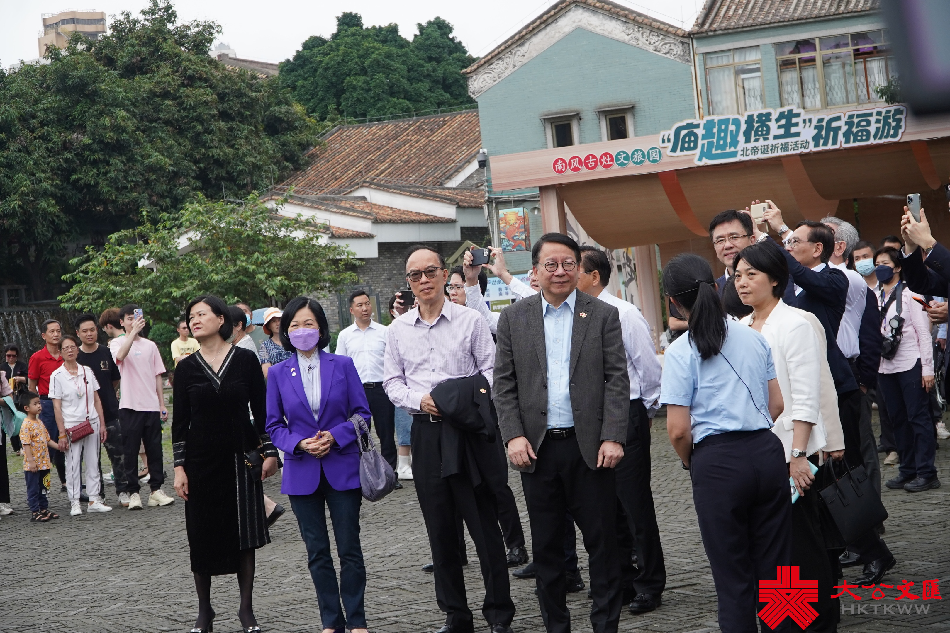 大公文匯全媒體報道,行政長官李家超今日(23日)率領香港特區政府及立法會大灣區訪問團繼續第三天訪問行程。下午2點左右,大灣區訪問團「紫組」佛山隊到達南風古灶,在南風古灶景區正門前合影後,參觀了南風古灶和高灶兩座柴燒古龍窯。