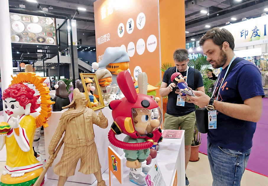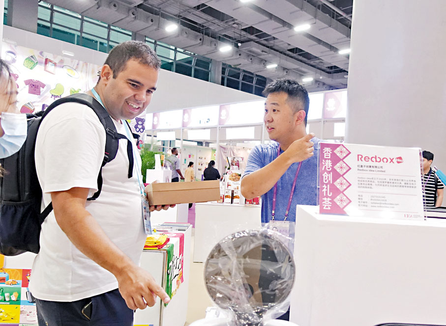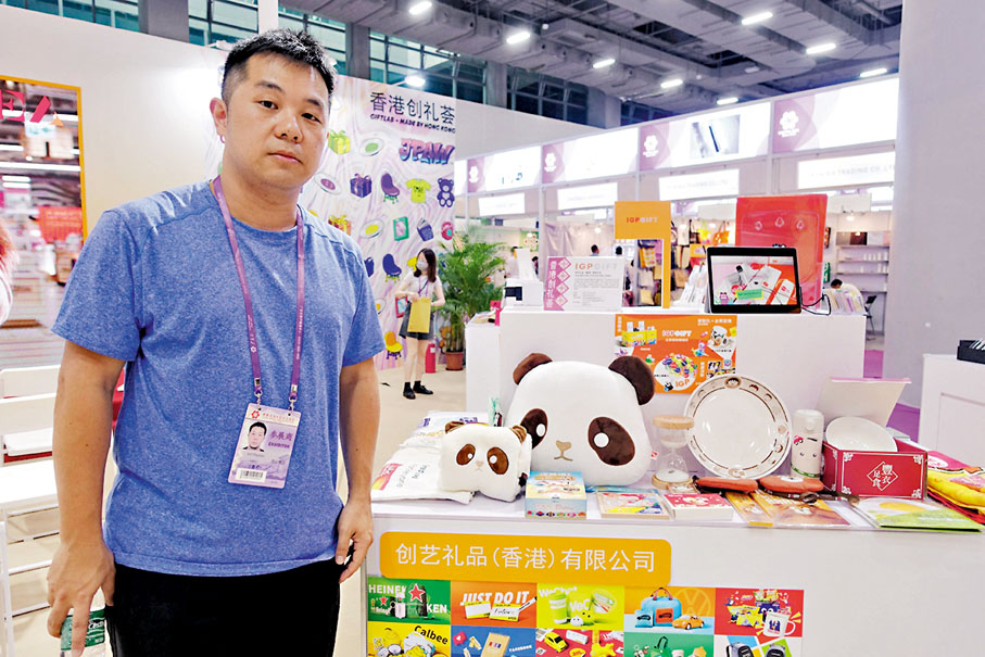 「香港創禮薈」香港展區以醒目的橙色作為主色調,集中展示香港設計師及文創領域等產品。熊貓抱枕、壽司主題桌遊、印有香港本土品牌的馬克杯、印有香港地鐵站名彩色馬賽克杯墊……「這些設計都是來自我們平台的香港設計師,比較有香港特色。我們的平台目前已經有8,000多個港澳台地區的設計師,很想帶着他們的設計作品打入內地市場。」創藝禮品(香港)有限公司負責人王嘉希表示,公司第一次以參展商形式參加廣交會,在香港展區還設了3個展櫃,展示公司在原創設計、客製化產品、網絡平台和設計代理方面的新產品。