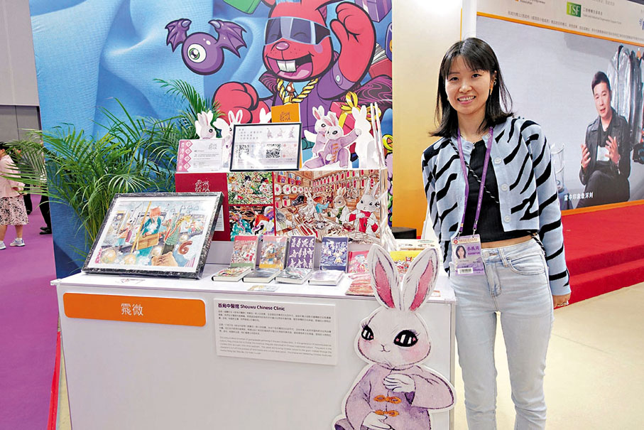 一隻童話風格的手繪兔子,身穿唐裝、擺出太極拳的姿勢,其清新可愛的風格吸引了不少採購商前來問詢。這隻小兔子名為「紅棗」,英文名「jujube」。「其實整個設計概念是基於自己一個《首烏中醫館》的漫畫而衍生的,作品的小動物名字均以中藥名命名。在追求西方潮流文化的年代,想透過一群中醫館做兼職的小動物,將中國文化帶到年輕人的市場。」香港䬠微創意總監林小姐說,她喜歡以小動物的形式去描繪當下年輕人的生存場景,比如在商場排隊、擠地鐵上班的香港青年等。「我希望藉着可愛的小動物的形象,想以中藥為主題,讓更多人了解和傳承文化。」