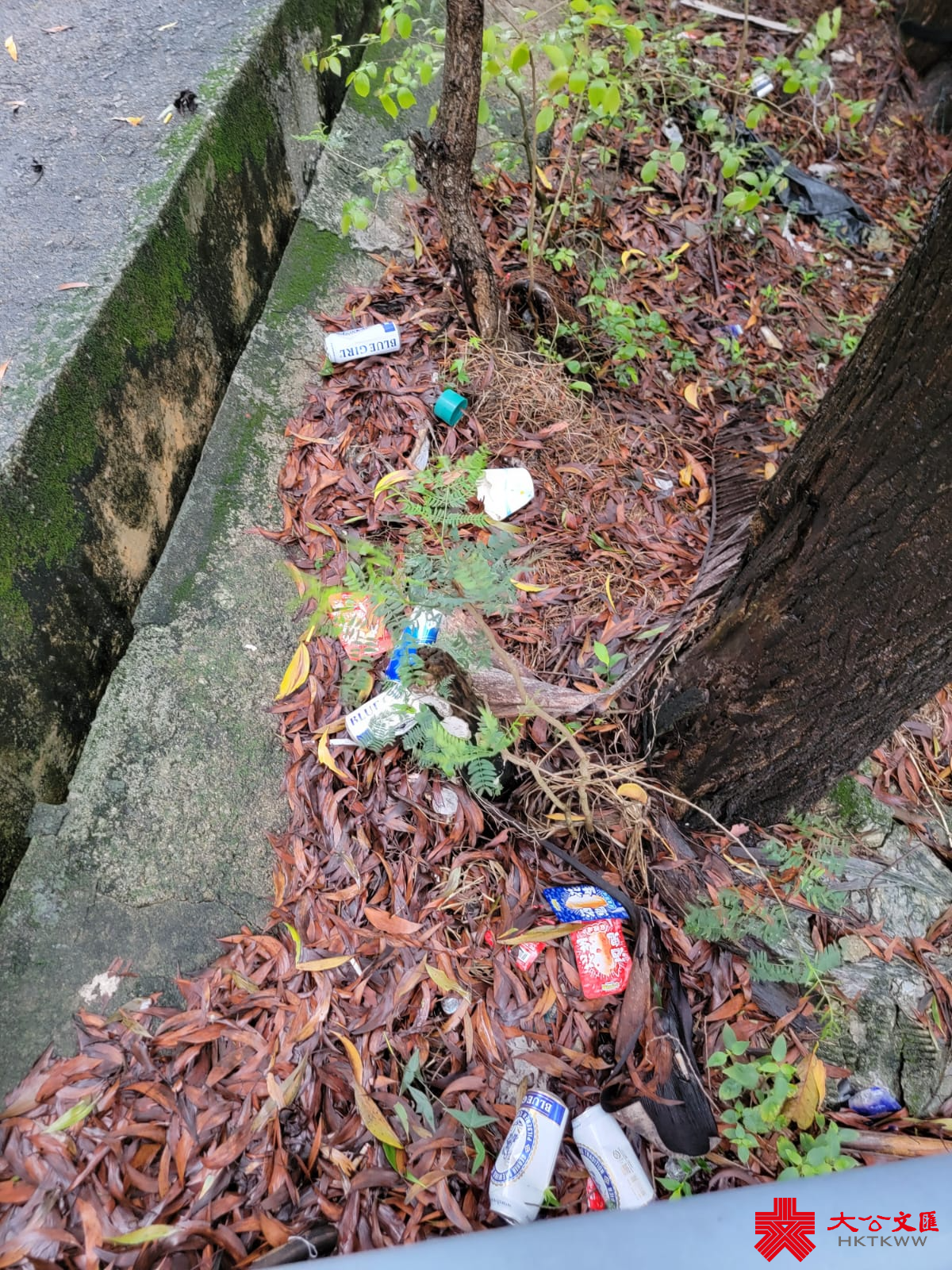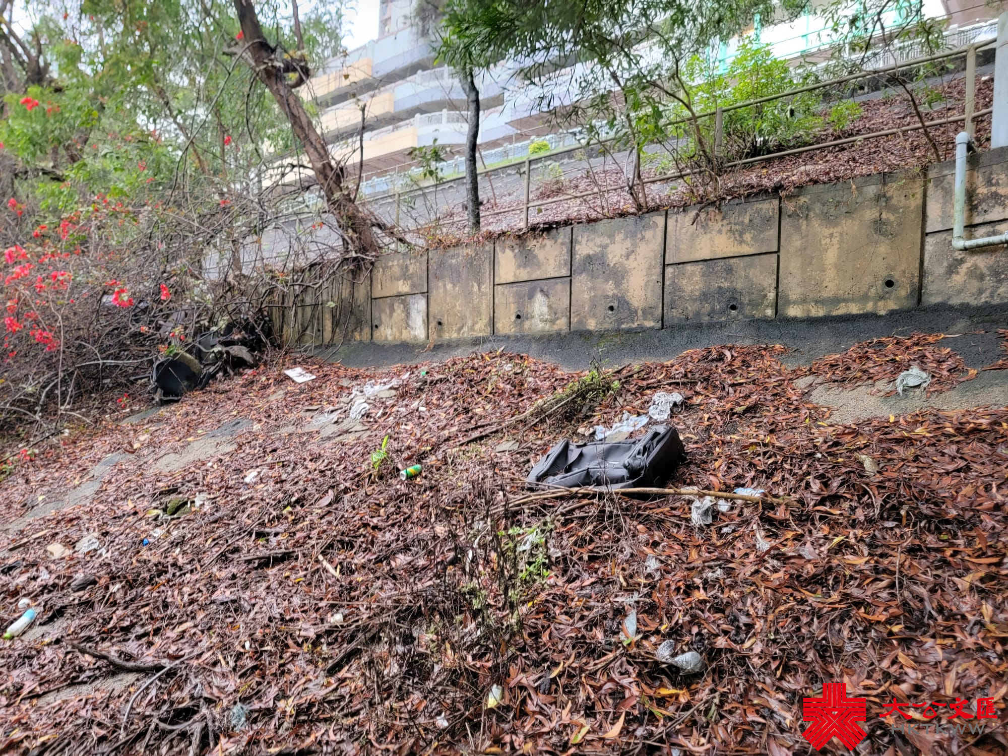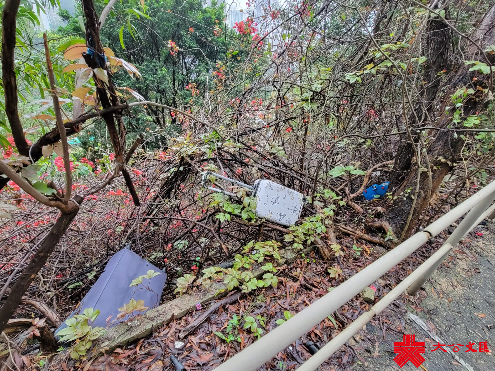 大公文匯全媒體記者4月中與立法會九龍東議員顏汶羽現場視察。只見山坡上草叢的垃圾比投訴片段所見為少,然而記者發現位於山坡下的樹林區域仍有大量垃圾,類型繁多,而且有大有小,如電腦櫈、發泡膠蓋、棄置梳化、旅行喼及飯盒廁紙等。