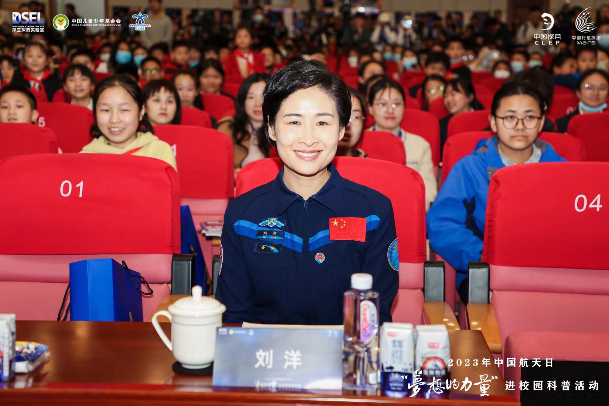 活動現場,劉洋作題為《與時代同行,與夢想同行》的航天科普課。她首先介紹了中國載人航天三步走的發展戰略以及她和戰友們共同執行神舟九號、神舟十四號載人航天飛行任務的概況,回顧了載人航天十年時間從天宮實驗室走到了空間站時代的歷程,她自豪地說:「每當我仰望星空,內心都無比激動,因為我知道,有一座我們親手建造的『太空之家』正遨遊蒼穹,這份成就令人心潮澎湃,無比的驕傲與自豪。」