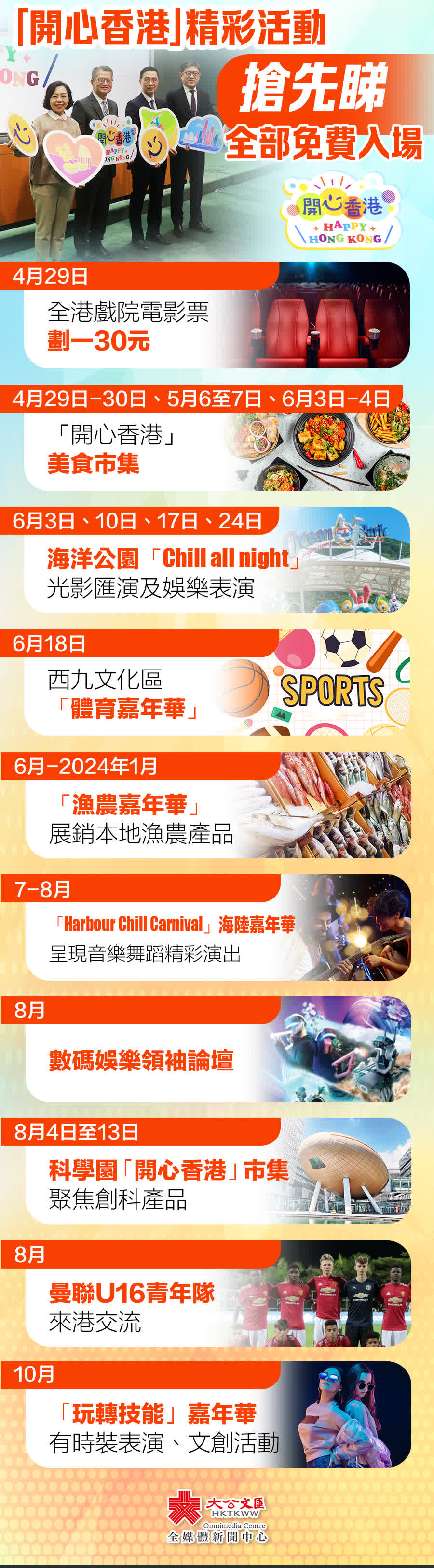大公文匯全媒體報道,政府今日(24日)公布,即將啟動以市民為對象的「開心香港」(Happy Hong Kong)活動,提供美食體驗、遊樂和文青創作等活動,刺激本地消費和經濟。一系列活動由本周末打響頭炮,觀眾可以於本星期六(29日)在全港戲院以優惠價30元購買戲飛入場;會展中心亦會一連兩日舉行「開心香港」美食市集,以環球美食為主題,加入青年元素,並設有表演、兒童遊戲等,以增添歡樂氣氛。記者整理了「開心香港」主要精彩活動,快啲嚟睇吓啦!