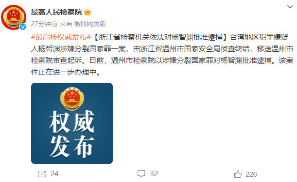 據最高人民檢察院官方微博消息,台灣地區犯罪嫌疑人楊智淵涉嫌分裂國家罪一案,由浙江省溫州市國家安全局偵查終結,移送溫州市檢察院審查起訴。日前,溫州市檢察院以涉嫌分裂國家罪對楊智淵批准逮捕。該案件正在進一步辦理中。