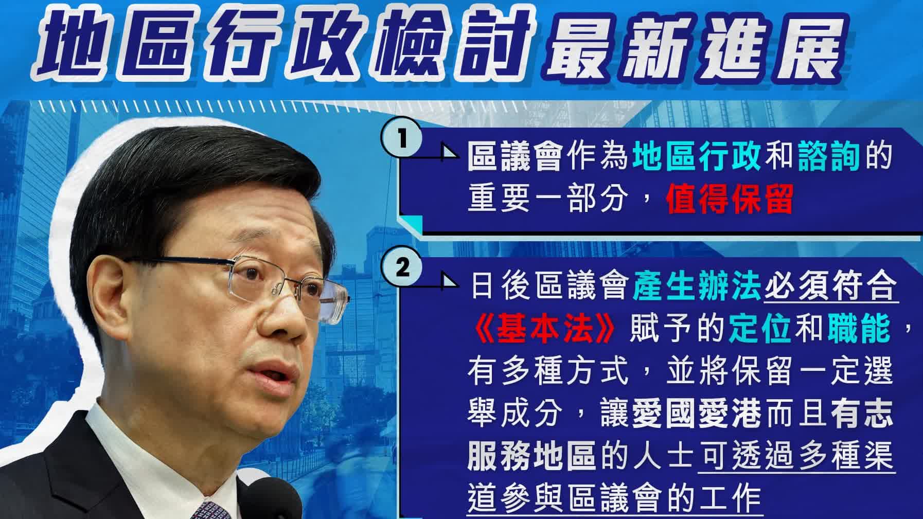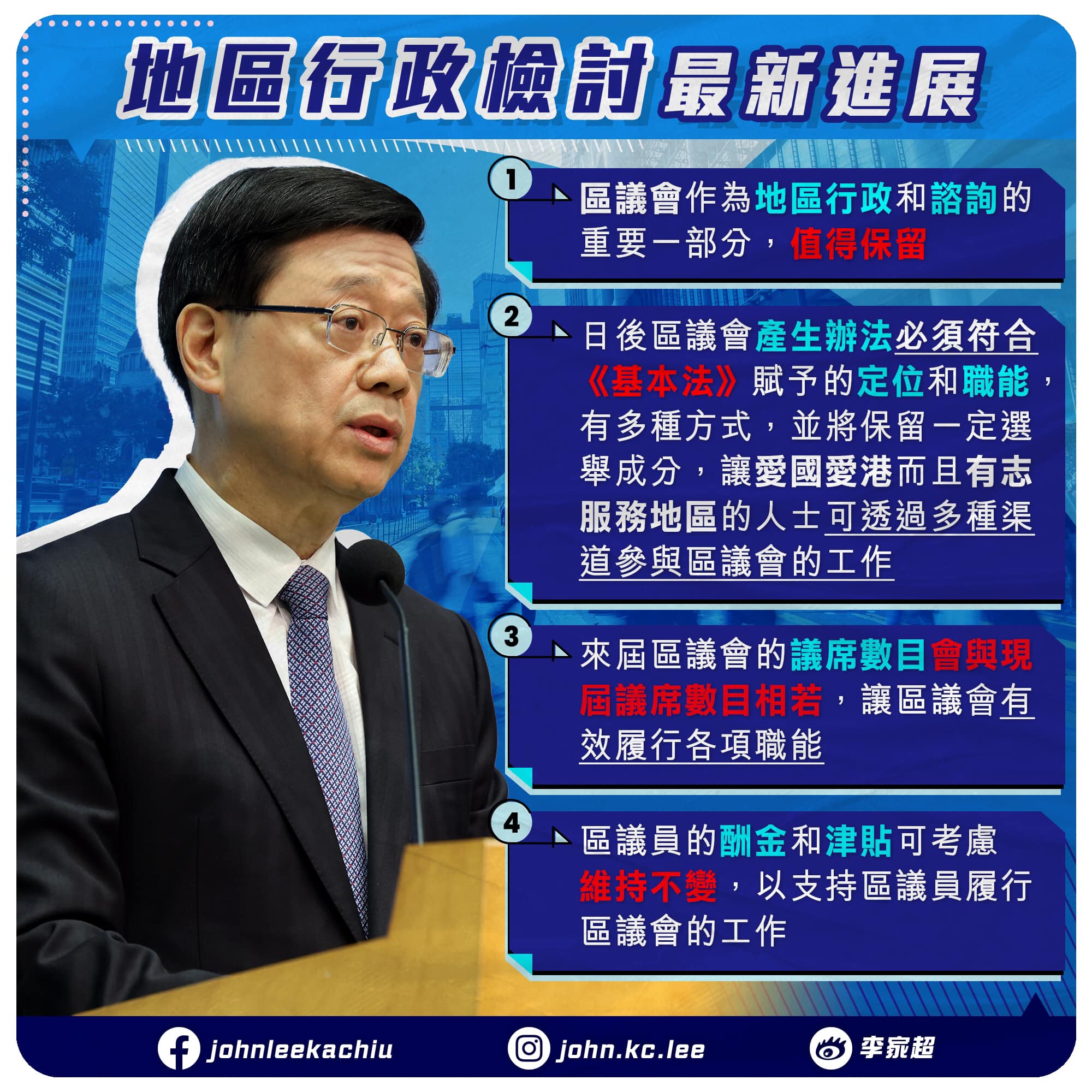 大公文匯全媒體報道,行政長官李家超今早(25日)出席行政會議前,向傳媒交代地方行政檢討已經進入最後階段。李家超在社交媒體上表示,在檢討過程中,就區議會的職能和組成達成四個結論:第一,區議會作為地區行政和諮詢的重要一部分,值得保留;第二,日後區議會產生辦法要符合基本法賦予的定位和職能,有多種方式並將保留一定選舉成分,讓愛國愛港而且有志服務地區的人士可透過多種渠道參與區議會的工作;第三,來屆區議會的議席數目會與現屆議席數目(即479席)相若,讓區議會有效履行各項職能;第四,區議員的酬金和津貼大可考慮維持不變,以支持區議員履行區議會的工作。在強化地區治理架構方面,會加強地區治理領導及統籌力度,運用好各部門的資源,提升地區治理工作,回應市民的需要。