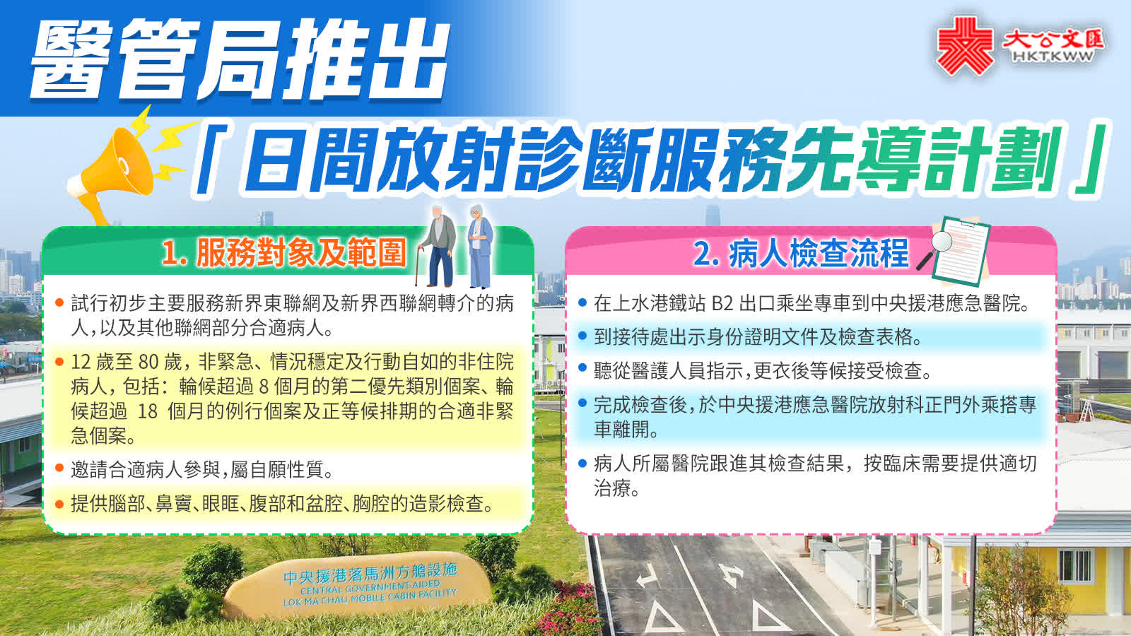 「日間放射診斷服務先導計劃」今日起開始運作,逢一至五朝9晚5開放,星期日及公眾假期除外。服務對象為12至80歲、非緊急、情况穩定及行動自如的非住院病人,包括:輪候超過8個月的第二優先類別個案、輪候超過18個月的例行個案及正等候排期的合適非緊急個案。醫院將安排免費專車接送病人往返上水港鐵站,每日來回各8班車。醫管局放射科統籌委員會主席李醒芬表示,先導計劃初步試行階段,主要會服務新界東聯網醫院轉介的病人,及後會擴展至新界西聯網,今年7月起,將會逐步增加其他聯網的服務數量。