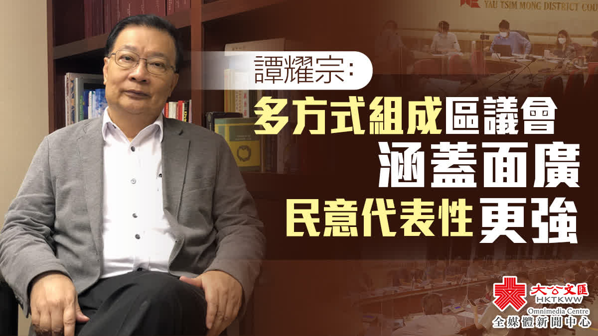 譚耀宗表示,區議會最初的產生辦法包括選舉、當然及委任等,後來漸漸變為絕大部分以選舉產生,而如今經過檢討後,顯然全由選舉產生不一定是好事,故他十分同意未來的區議會以多種方式產生,譬如可以間選等方式從富地區服務經驗者中選拔,或者可針對區議會組成所需或缺乏的界別或專業人士作出委任補充等,以促進區議會的組成比過去更多元、全面,能更廣泛聆聽、反映不同階層的市民聲音。他強調,區議會的代表性與是否以選舉產生根本無必然關係。