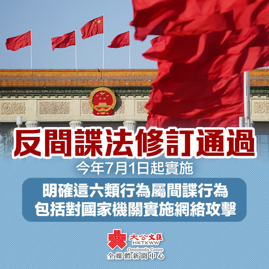 大公文匯網報道,十四屆全國人大常委會第二次會議今日(26日)表決通過修訂後的反間諜法。修訂後的反間諜法將於2023年7月1日起施行。新法完善了間諜行為的定義,將「投靠間諜組織及其代理人」、「針對國家機關、涉密單位或者關鍵信息基礎設施等實施網絡攻擊等行為」明確為間諜行為。