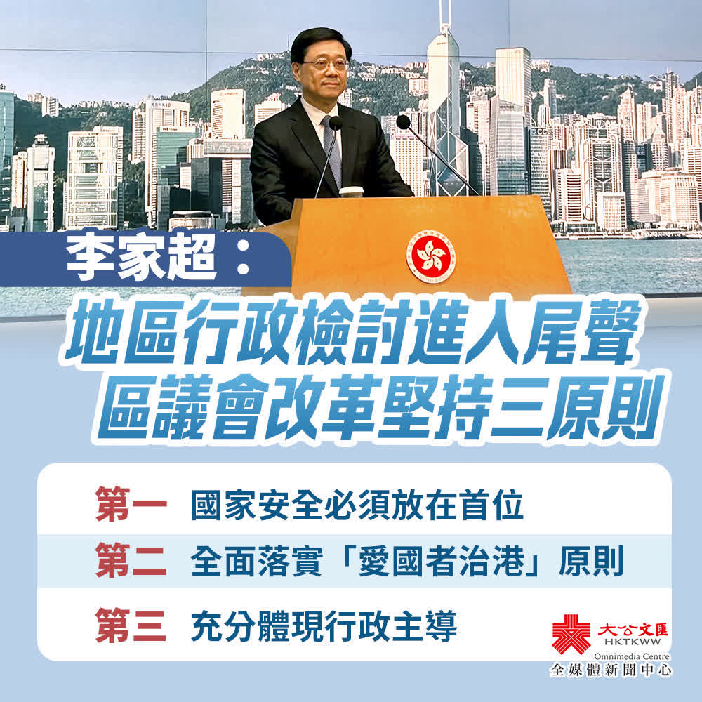 地區行政檢討進入最後階段,特首李家超表示,今次檢討必須堅持三個原則,包括將國家安全放在首位、全面落實「愛國者治港」及充分體現行政主導。區議會作為香港地區治理的重要一環,必須透過改革正本清源,確保其主導權牢牢掌握在愛國者手中,根除政治隱患,提高地區治理效能,回歸為居民服務的本位。