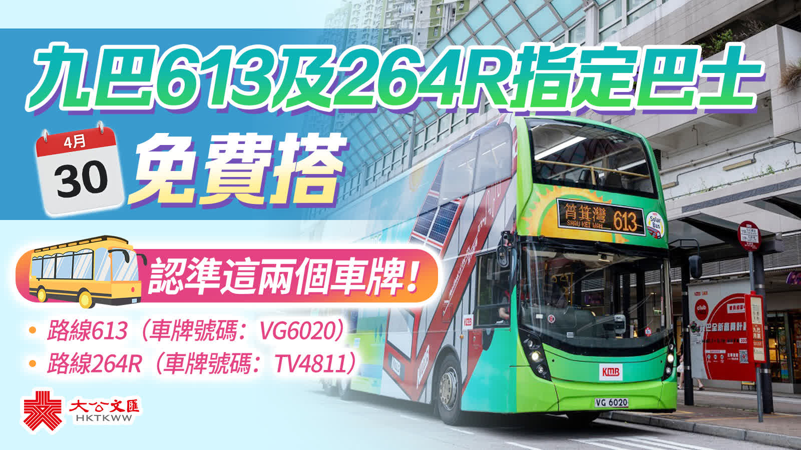 4月30日舉辦的免費乘車日,全港市民當日可無限次免費乘搭行走路線613 [安泰(西)(和泰樓) ⇋ 筲箕灣]的太陽能主題巴士(車牌號碼:VG6020),以及路線264R [天耀 ⇋ 大埔墟站] 的太陽能主題巴士(車牌號碼:TV4811)。除了指定班次提供免費乘車日,九巴亦會安排其他太陽能巴士行駛該兩條路線的其餘班次,讓市民可體驗減碳節能的巴士服務。