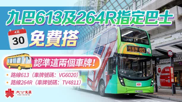 大公文匯全媒體報道,九巴周日(30日)將舉辦免費乘車活動,邀請全港市民全日無限次免費乘搭指定九巴路線及班次,以推廣綠色運輸。
