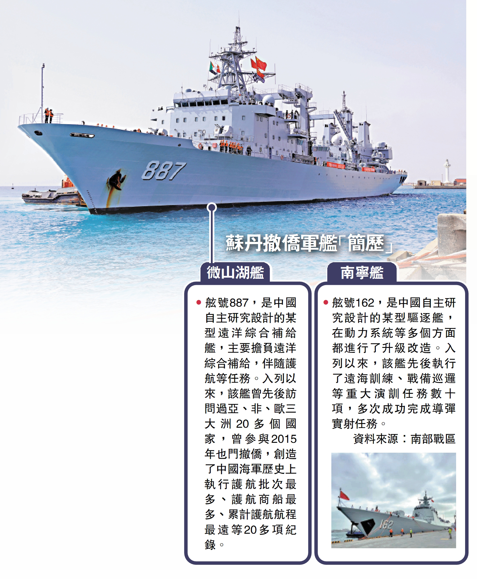 (大公報記者丁春麗、張寶峰綜合新華社、央視新聞報道)近日,蘇丹多地爆發武裝衝突,局勢突變。當地時間4月26日,中國海軍緊急調動在亞丁灣護航的導彈驅逐艦南寧艦、綜合補給艦微山湖艦緊急駛赴蘇丹,執行撤僑任務,多方守望相助,共同上演了現實版的「萬里歸途」。「心情非常激動,真的非常激動!」順利搭乘軍艦撤離的張山(化名)表示,「我為我是中國人感覺無比的驕傲和自豪!」中國外交部表示,截至目前,已有1300多名中國公民從蘇丹安全轉移,其中包括香港特區居民。