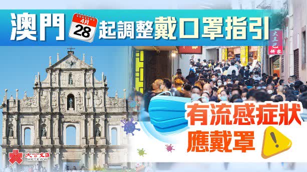 大公文匯全媒體報道,澳門今日(28日)起調整佩戴口罩指引,將佩戴口罩情況分成三類:個人和機構須遵守「應佩戴口罩」的要求;在「建議佩戴口罩」的情形下,市民可自行作出決定;在室外地方等場合則「可不佩戴口罩」。