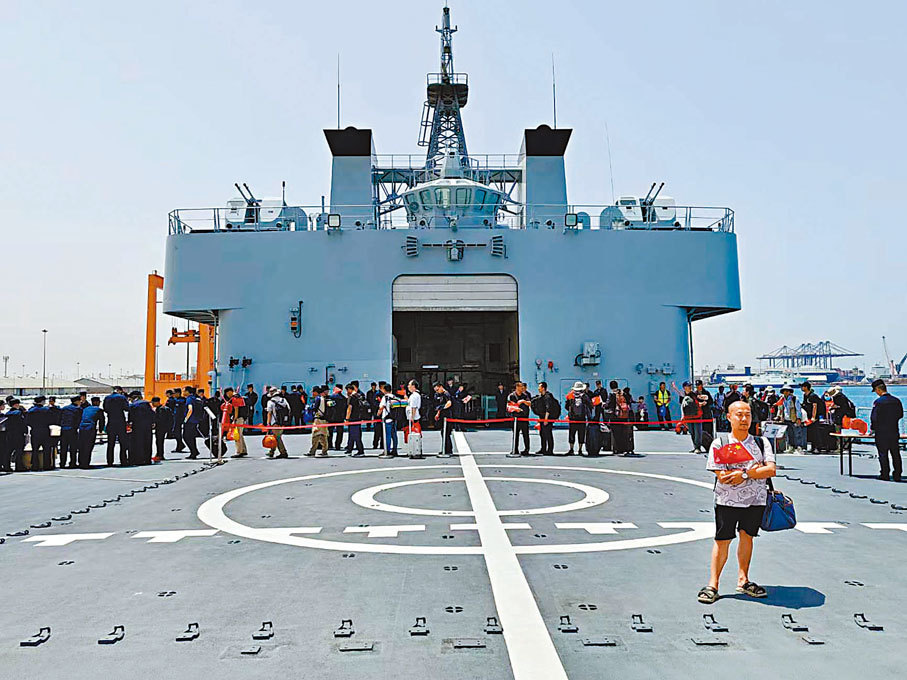 海軍軍旗迎風飄揚,甲板上到處都是前來簽名和留影的人,張山在簽名簿上鄭重地留下了自己的名字。揮舞着國旗,他也和海軍軍旗拍了一張合影。