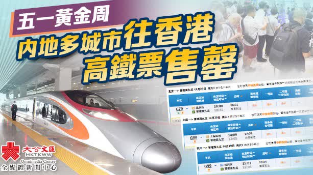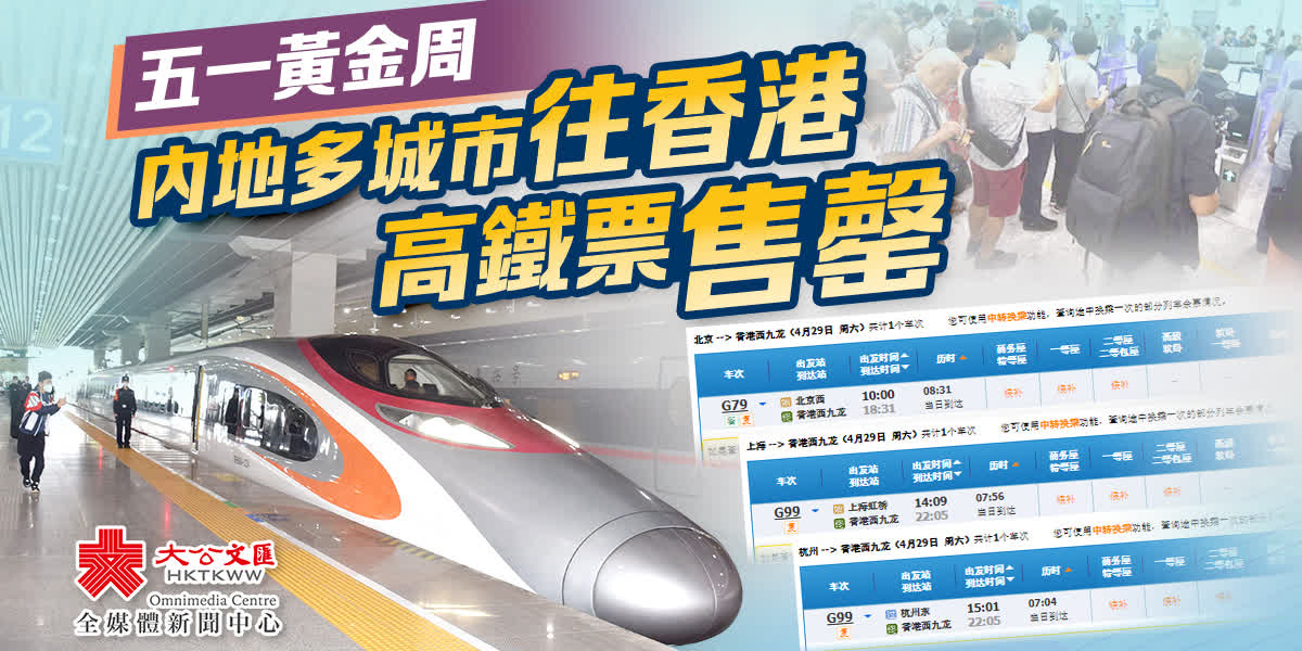 大公文匯全媒體報道,通關後首個「五一」黃金周(4月29日至5月3日)將至,內地民眾鐵路出行需求暴增。鐵路部門預計,假期每日開行超過1萬列列車,內地多個城市往香港的高鐵車票已售罄。