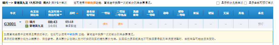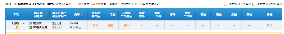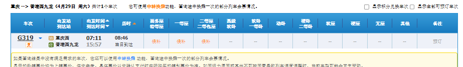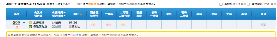 全媒體記者今日登入12306網站查詢,發現明日(29日)北京、上海、杭州、福州、重慶至香港西九龍高鐵票已全部售罄,長沙至香港西九龍幾乎售罄;至於廣東省內,廣州、深圳及汕頭等至香港西九龍的高鐵票大部分亦已售罄,餘量不足。