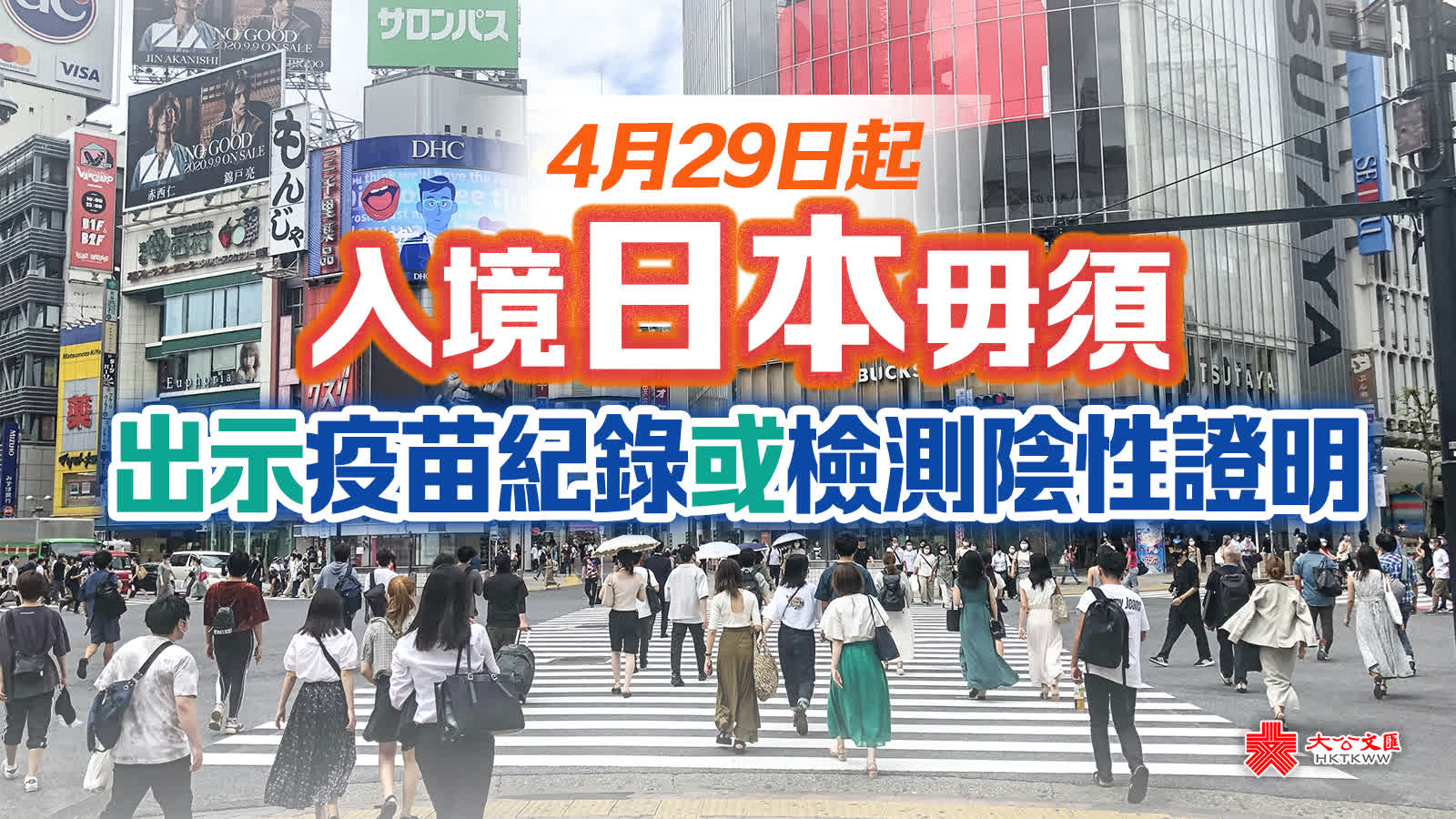 大公文匯全媒體報道,日本內閣官房長官松野博一周五(28日)宣布,周六(29日)開始入境日本人士,毋須出示新冠疫苗接種記錄或病毒檢測陰性證明。