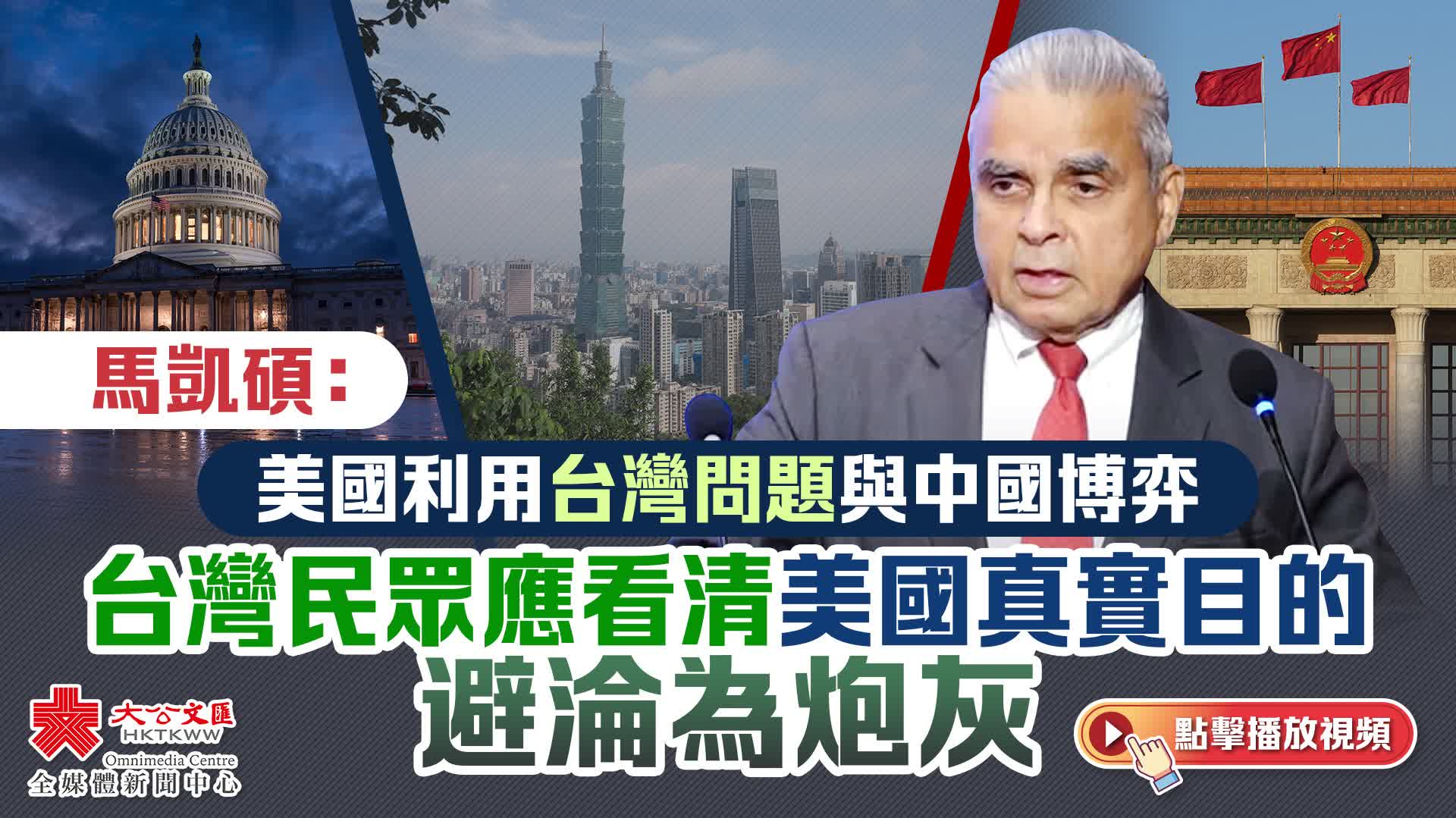 馬凱碩以一盤棋局形容台灣問題,在這場地緣政治棋局中,台灣只是很容易被美國犧牲的馬前小卒。「台灣問題就像一盤棋,台灣就是棋子。棋子是什麼?是容易被犧牲的,美國無緣無故地給了一些好處給台灣,就是為了犧牲台灣完成自己的政治表演,與中國博弈而已。」他提醒台灣人民,應當清醒地意識到美國的真正目的,「不要在這場政治交火中淪為炮灰」。