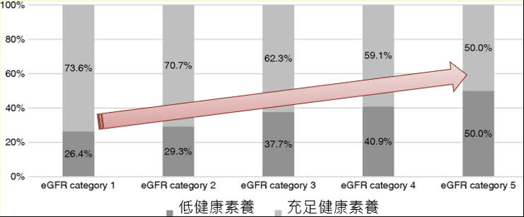 葉醫生認為健康素養對腎友尤其重要,他指出研究報告顯示,健康素養不足有機會導致較高的慢性腎病病發率(下圖)。而低健康素養亦會減低腎友得到腎移植的機會。另外,周醫生表示即使是末期腎病患者,亦不代表其對腎病的健康素養相對於早期患者有明顯提高。因此,周醫生指出提高健康素養能改善腎友對治療的依從性,亦可減低心血管併發症的風險,並且增加腎移植的機會。所以提高健康素養對接受不同治療的腎友都非常重要。