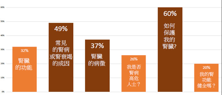 雷醫生強調健康素養需要醫護與病人的相向互動。醫護人員要了解病人希望得到什麼健康資訊,及在何時和如何獲得資訊。根據國際腎臟基金會聯合會——世界腎臟聯盟 (IFKF-WKA)的先導研究,如何保護腎臟和腎病/腎衰竭的成因都是腎友們關注的問題(下圖)。吳醫生表示大部分腎友(69%)都希望從醫院/診所得到健康資訊,亦有多於10% 的腎友會從網站接收有關訊息。