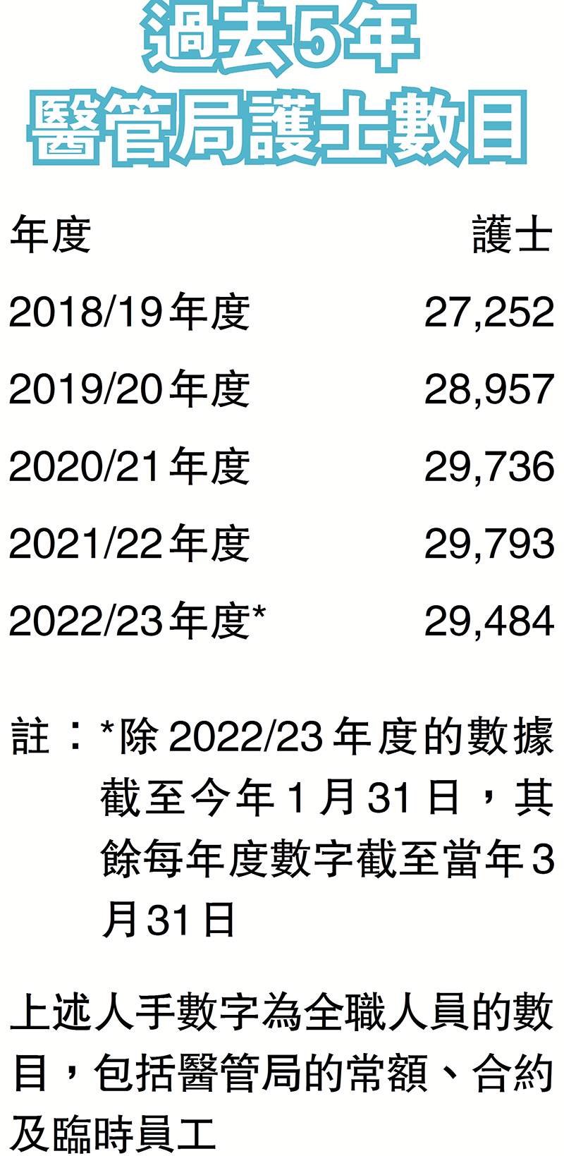 香港人口老化嚴重,對醫療需求大增,護士短缺一直是繼房屋問題後,特區政府另一難題。截至去年年底,全港公私營共有66,492名護士,當中公營機構護士的流失率一直上升,在2021/22年,衞生署註冊護士和登記護士的流失率分別達11.2%和14.8%;而醫管局註冊護士和登記護士的流失率則分別為9.1%及12.8%。此外,醫管局全職精神科護士的流失率由2019/20年的3.5%,急升至2021/22年度的7.8%。除了公院搶人才外,社福界也面對招聘及挽留護士人才的挑戰,截至去年底,共有約4,400名護士受僱於獲發牌照的安老院及殘疾人士院舍。