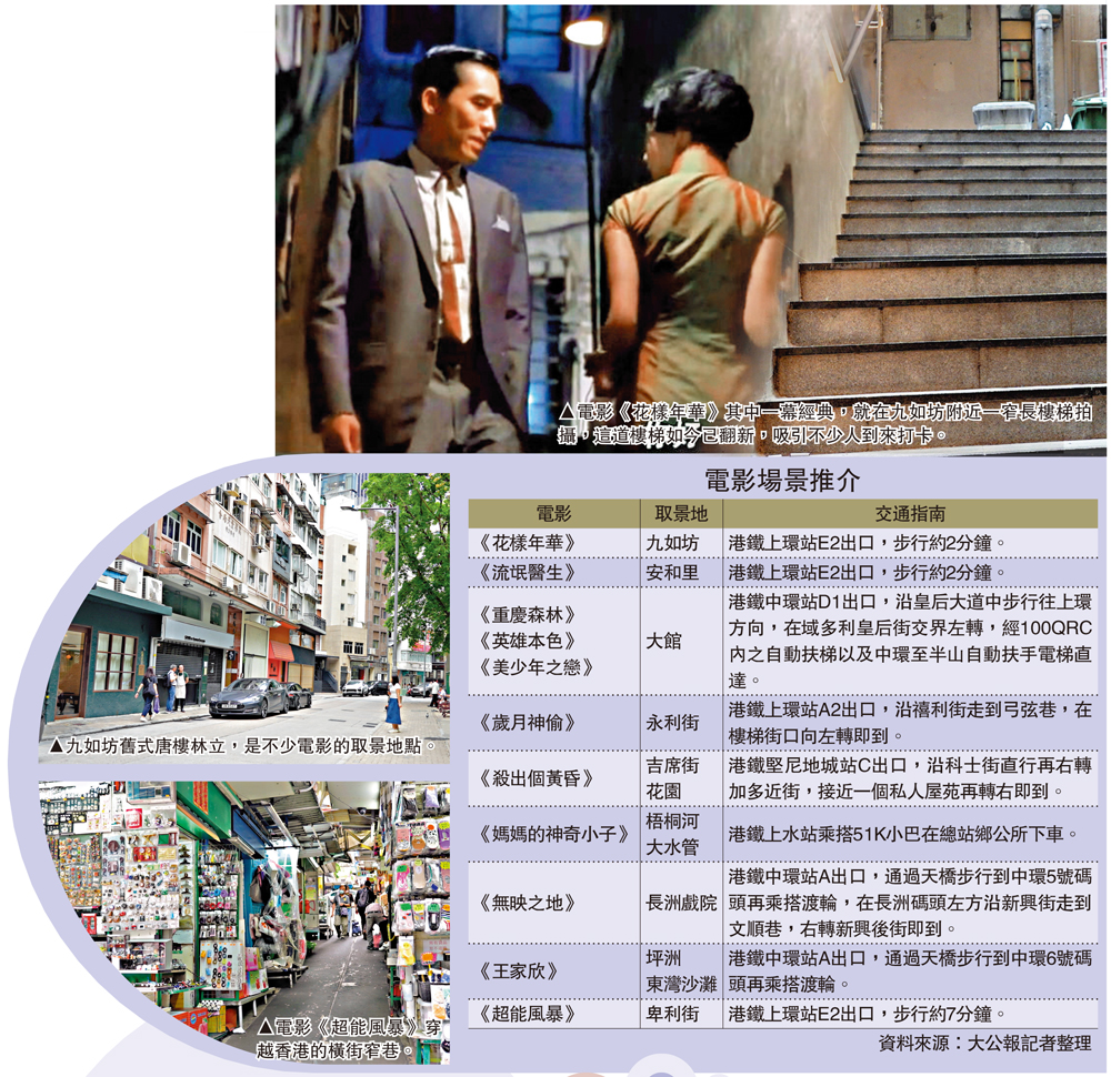 (大公報記者 楊州<文> 許棹傑<圖>)今天「全港戲院日」,大家有沒有入場睇戲?電影是城市行銷的「最佳拍檔」,多部膾炙人口的電影均在香港取景,包括《火拼時速》、獲多個電影獎項的《花樣年華》等。舊油麻地警署、廟街等場景已成為年輕旅客的朝聖打卡熱點,將「靚」相分享至社交平台如小紅書等,吸引更多人慕名而來。