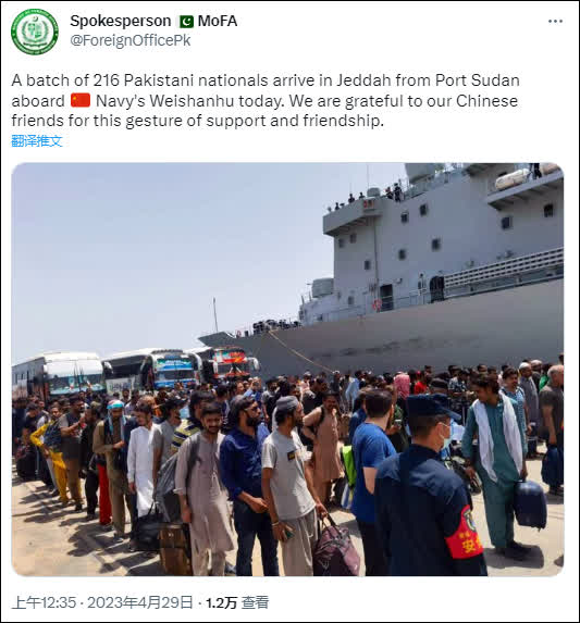 「又一批216名巴基斯坦公民乘船從蘇丹港抵達吉達,他們今天搭乘的是中國海軍『微山湖』艦。我們感謝我們的中國朋友給予的支持和友誼。」布洛奇在推特上寫道。