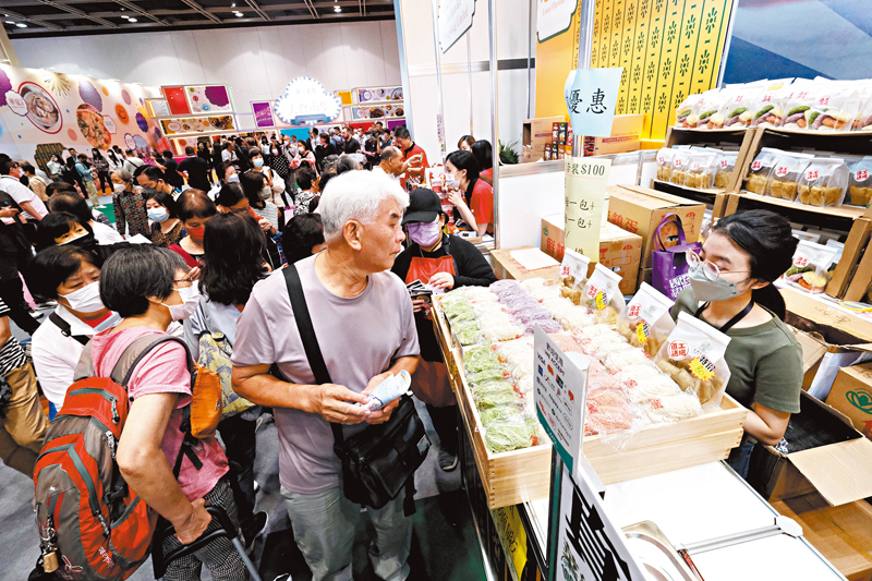 今次美食巿集的10萬張免費門票早前已派罄,所預留小量現場派發的門票亦很快派完。香港文匯報記者昨日在場內所見,不少市民拖篋到場「掃貨」。有入場市民表示,在疫情期間舉行的美食博覽不准飲食,今次有試食覺得開心,笑言:「唔係好貴喎,貴我唔買㗎。」有內地旅客亦特地到場購物,表示特意到場品嘗美食。