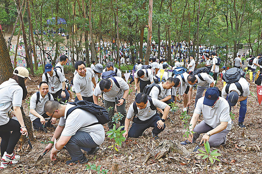 (香港文匯報 記者 子京)「2023 綠的歡欣 香港植樹日」活動昨日在元朗大棠(大樹下西路)舉行,特區行政長官李家超、香港中聯辦主任鄭雁雄、駐港國安公署副署長李江舟、外交部駐港特派員劉光源、駐港部隊政治委員賴如鑫等共同為植樹儀式主禮。今年駐港部隊派出了900名官兵參與植樹,聯同來自商界、社福界、地區組織、紀律部隊、公營機構和學界的義工們,植樹陣容多達2,100人,共攜手栽種了8,000棵樹苗。李家超致辭表示,植樹有如育人,十年樹木,百年樹人。「香港的發展一直依賴優質的人才,所以我們積極招攬全球頂尖專業創新人才和企業家,招商引資來香港開拓發展。香港是全體居民的共同家園,我希望和大家一起努力,創建香港在新時代發展的新篇章。」