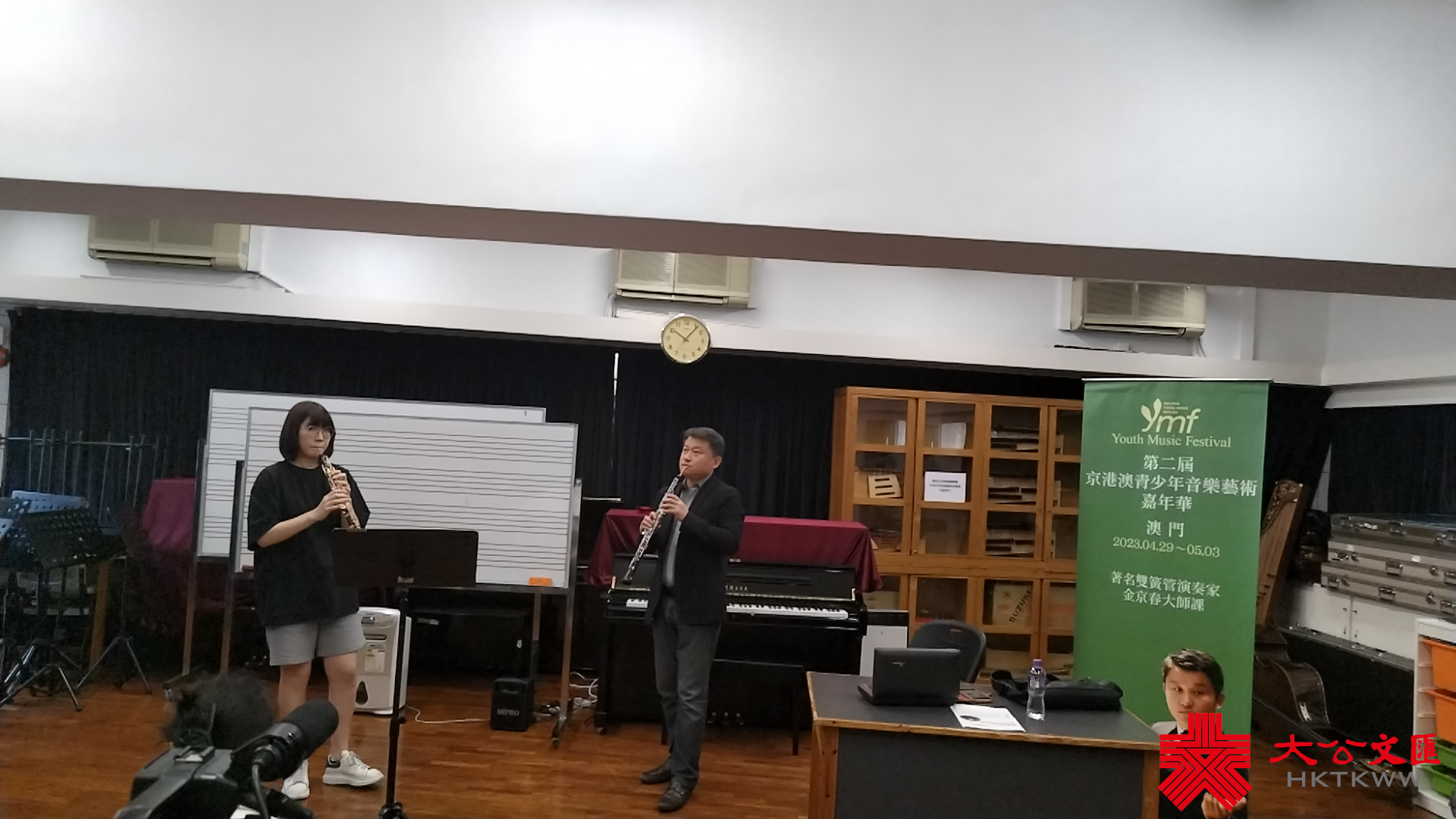 在雙簧管演奏家金京春的大師課上,來自內地和澳門的學生同堂學習。金京春在聽完一位澳門學生的雙簧管演奏後,一邊親身示範一邊指導學生需要改進之處。經過一番示範調整,最後在他的示範帶動下,澳門學生的演奏有了明顯的進步。