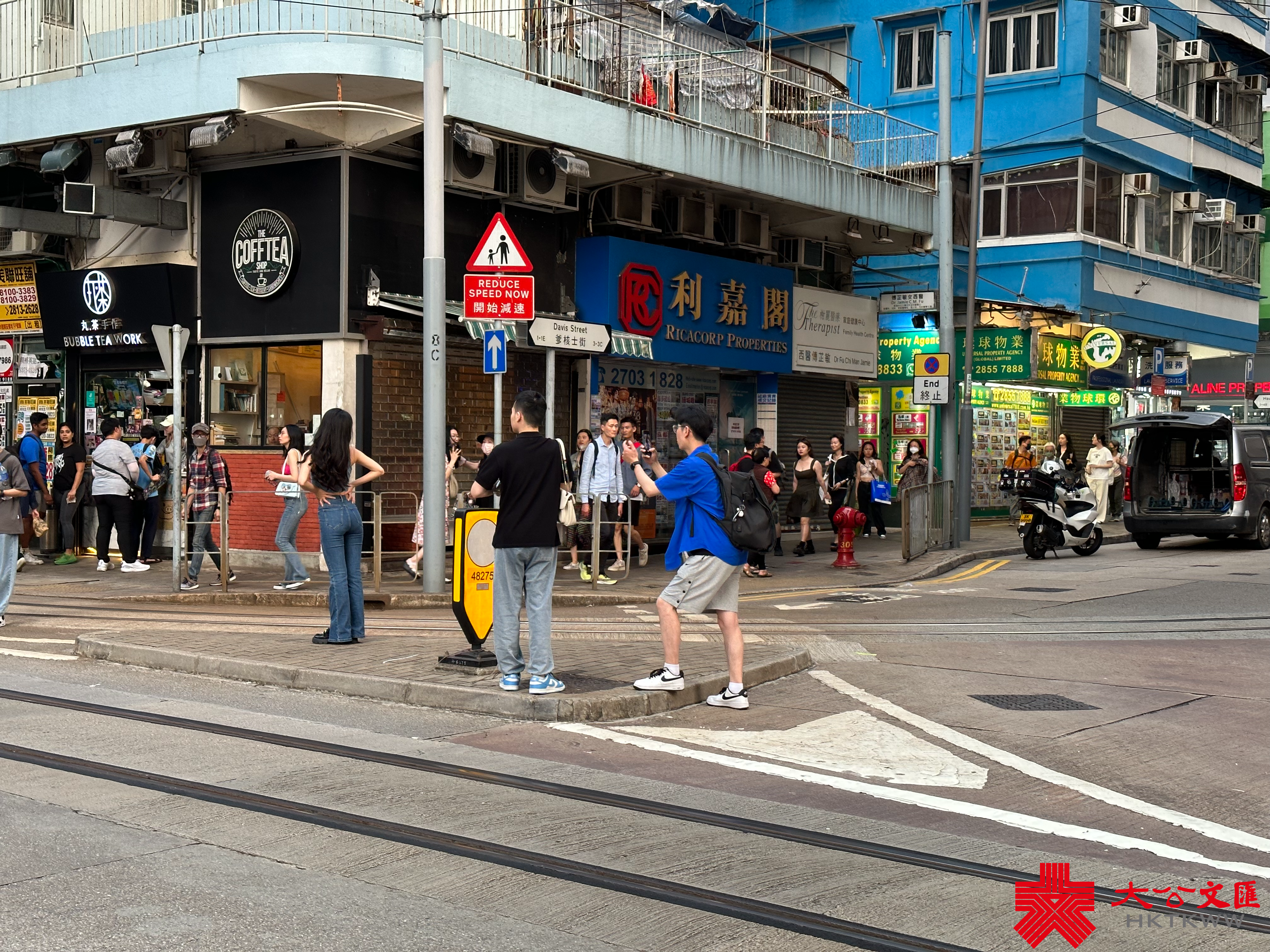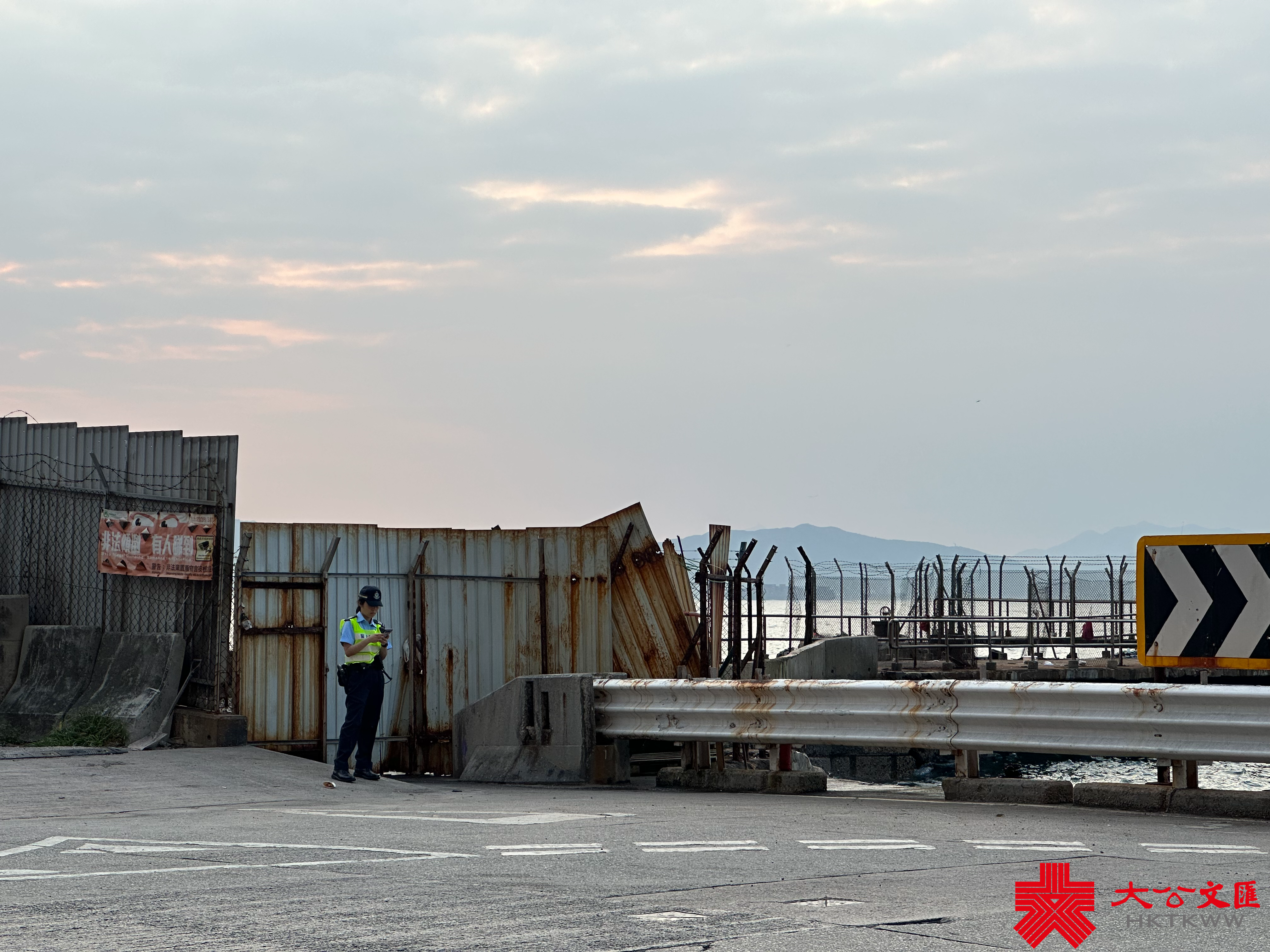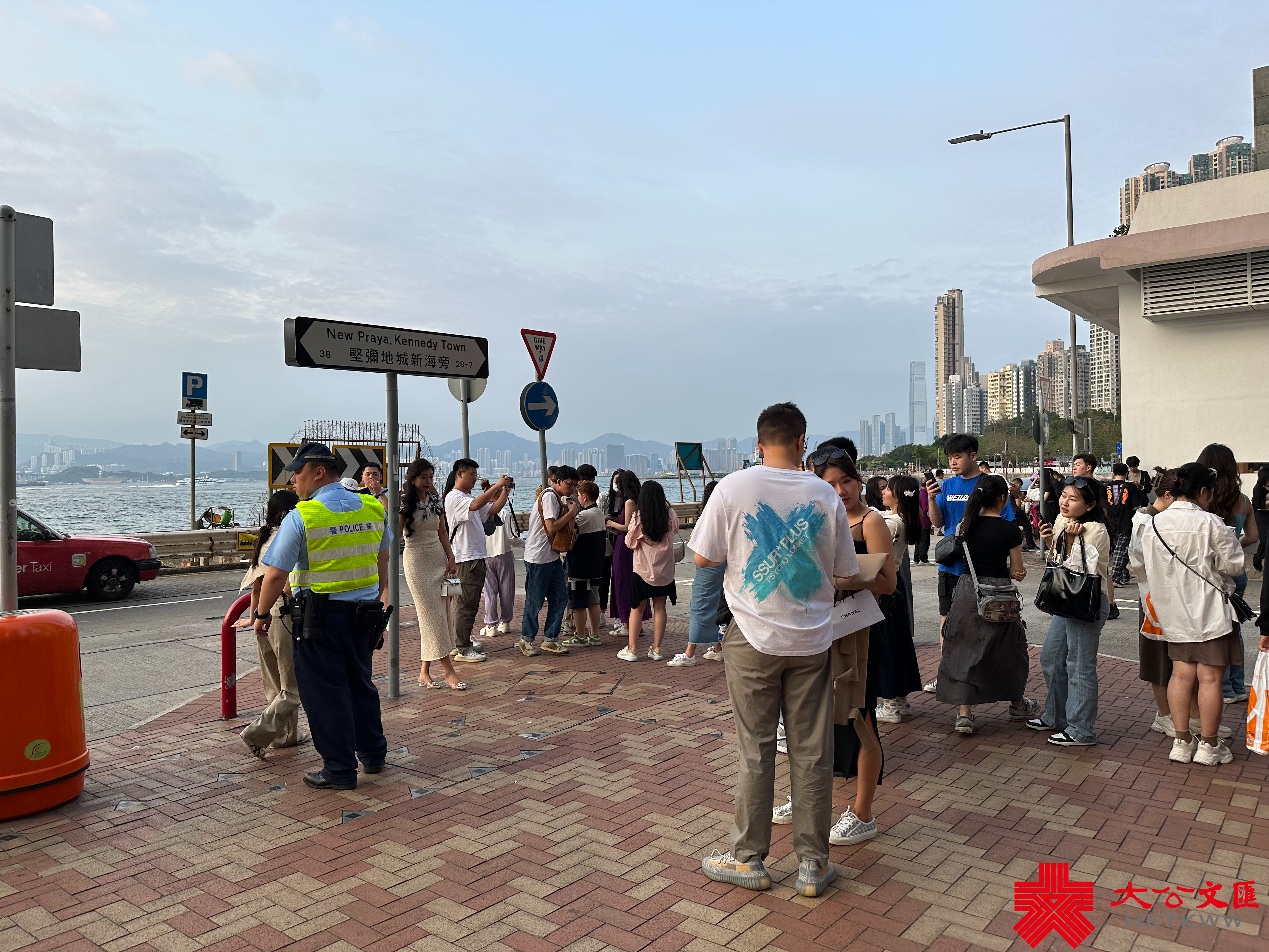 過往在堅尼地城新海旁,常有「打卡」人士站出馬路取景,造成人車爭路亂象,亦危及遊客自身安全。不過,今日有警員在場維持秩序,勸喻打卡人士注意安全,因此遊客們僅在馬路邊拍照,沒有再行出馬路。