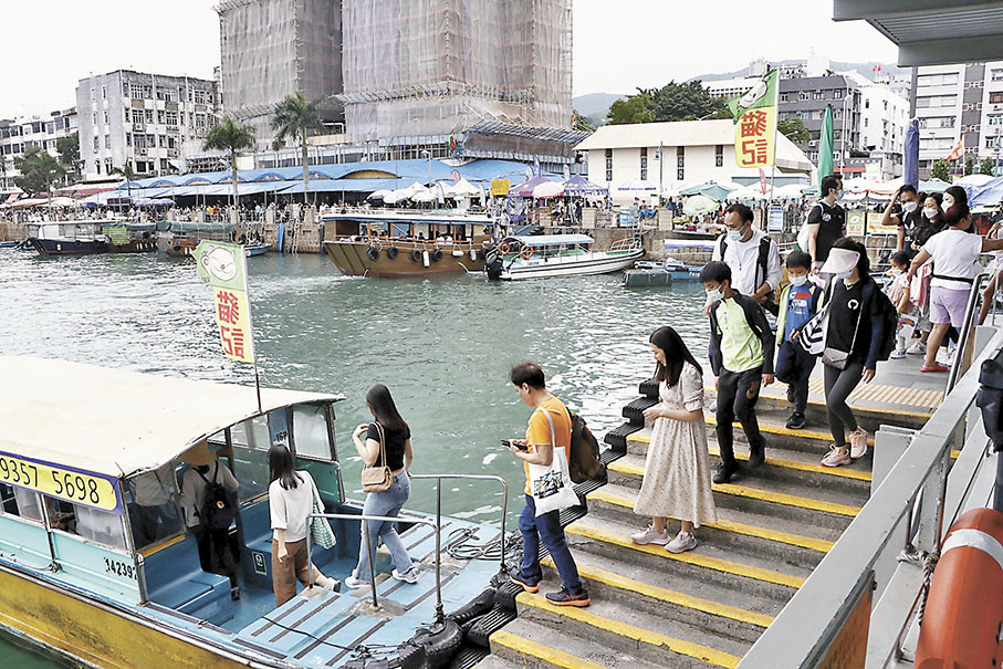 除西貢外,長洲等離島亦是不少內地旅客選擇的目的地,以感受本港的小島風情。中環往長洲的5號碼頭昨早便出現長長的人龍並打了數個「蛇餅」,船公司要加派職員疏導旅客,並特別加開班次,當中除本地居民外,不少是五一假期來港的內地個人遊訪客。