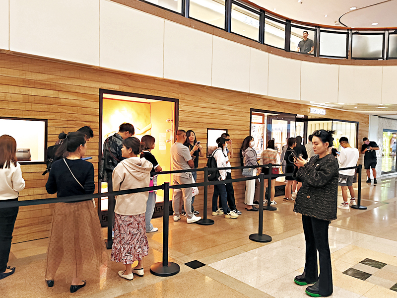 昨日下午,香港文匯報記者來到海港城看到,無數的時裝、禮品、箱包等吸引了大量內地客光顧。尤其是一些奢侈品店更是擠滿了許多內地客。在愛馬仕店前,大量內地客排着長龍等候進店選購,目測有二三十位人在排隊。據在海港城工作的張小姐透露,進店門檻很高,通常要購買數十萬港幣以上的箱包才可以入內挑選,便宜的也十萬多港幣,並且幾乎均是內地人。