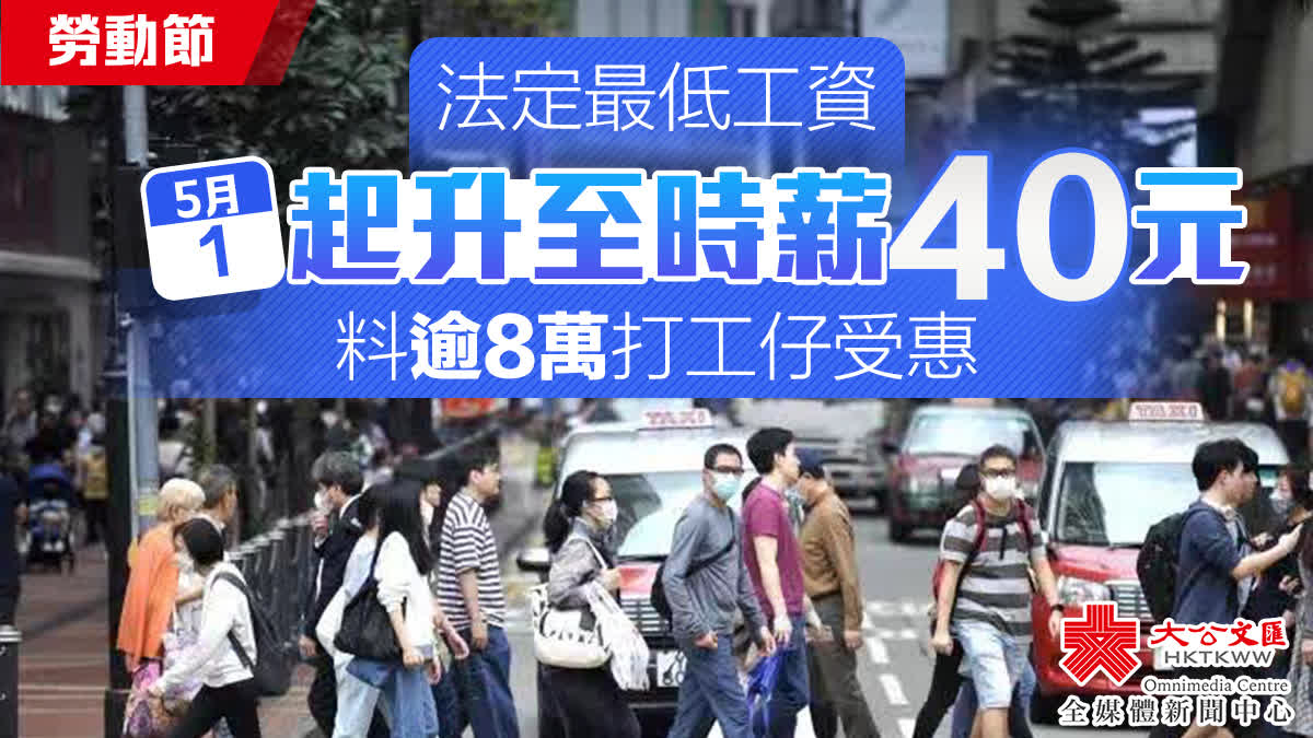 大公文匯全媒體報道,香港法定最低工資水平「凍結」4年後,於今日(5月1日)起上調至每小時40元,增幅約為6.7%。最低工資調升後,預計約8.7萬名低薪僱員獲加人工。