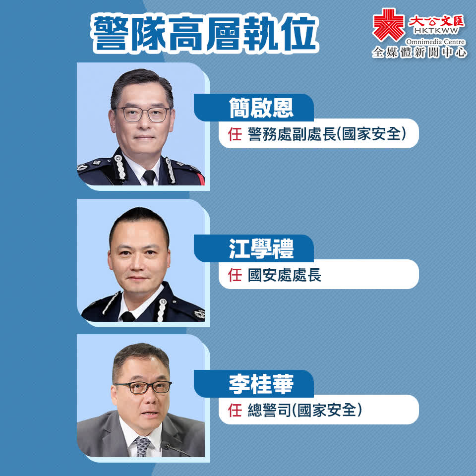 大公文匯全媒體報道,行政長官李家超今日(2日)按《中華人民共和國香港特別行政區維護國家安全法》第十六條第二款,任命簡啟恩為警務處維護國家安全部門負責人,接替已退休的警務處副處長(國家安全)劉賜蕙。簡啟恩的任命今日生效,他同日宣誓就任。同時,李家超根據香港基本法第四十八(七)條任命李桂華為總警司(國家安全),任命今日生效。