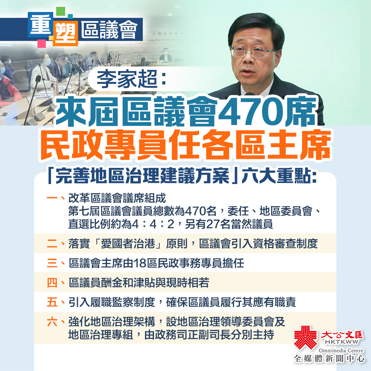 聲明提到,我們相信,新一屆區議會將更均衡及多元化,有利於各方面愛國愛港人士廣泛參輿,真正匯聚民智民力,有效提升香港的地區治理效能。我們希望,社會各界齊心協力,大力支持特區政府依法施政,配合做好完善地區治理相關工作,為服務市民、促進良政善治、推動「一國兩制」行穩致遠做出應有貢獻。
