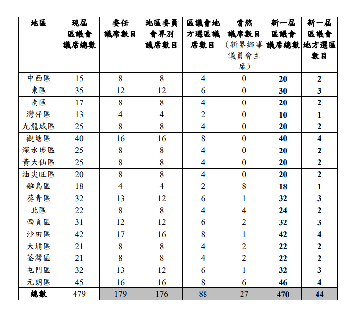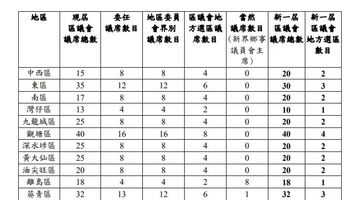 分配得最多選區的地區為觀塘、元朗及沙田;其次為東區、葵青、西貢及屯門。在18區當中元朗、沙田及觀塘分別佔46、42及40席,是最多議席的3個選區。