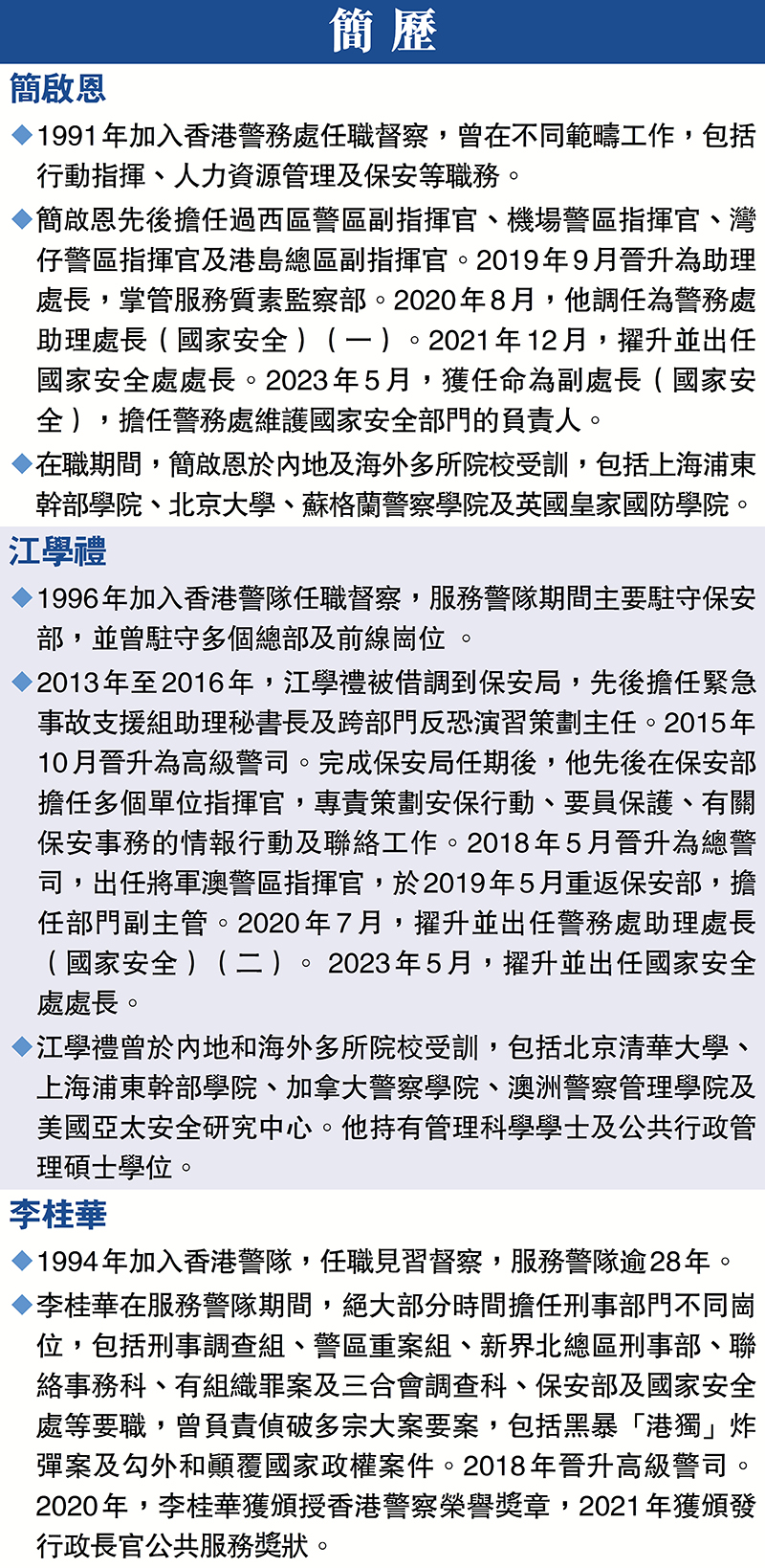 (香港文匯報記者 蕭景源)香港特區行政長官李家超昨日按《中華人民共和國香港特別行政區維護國家安全法》(香港國安法)第十六條第二款,任命簡啟恩為警務處維護國家安全部門負責人,接替已退休的警務處副處長(國家安全)劉賜蕙。簡啟恩的任命昨日生效,他同日宣誓就任。警務處助理處長(國家安全)(二)江學禮獲警務處處長擢升為高級助理處長,接替簡啟恩出任國家安全處處長。行政長官並根據基本法第四十八(七)條,任命李桂華為總警司(國家安全),昨日生效。